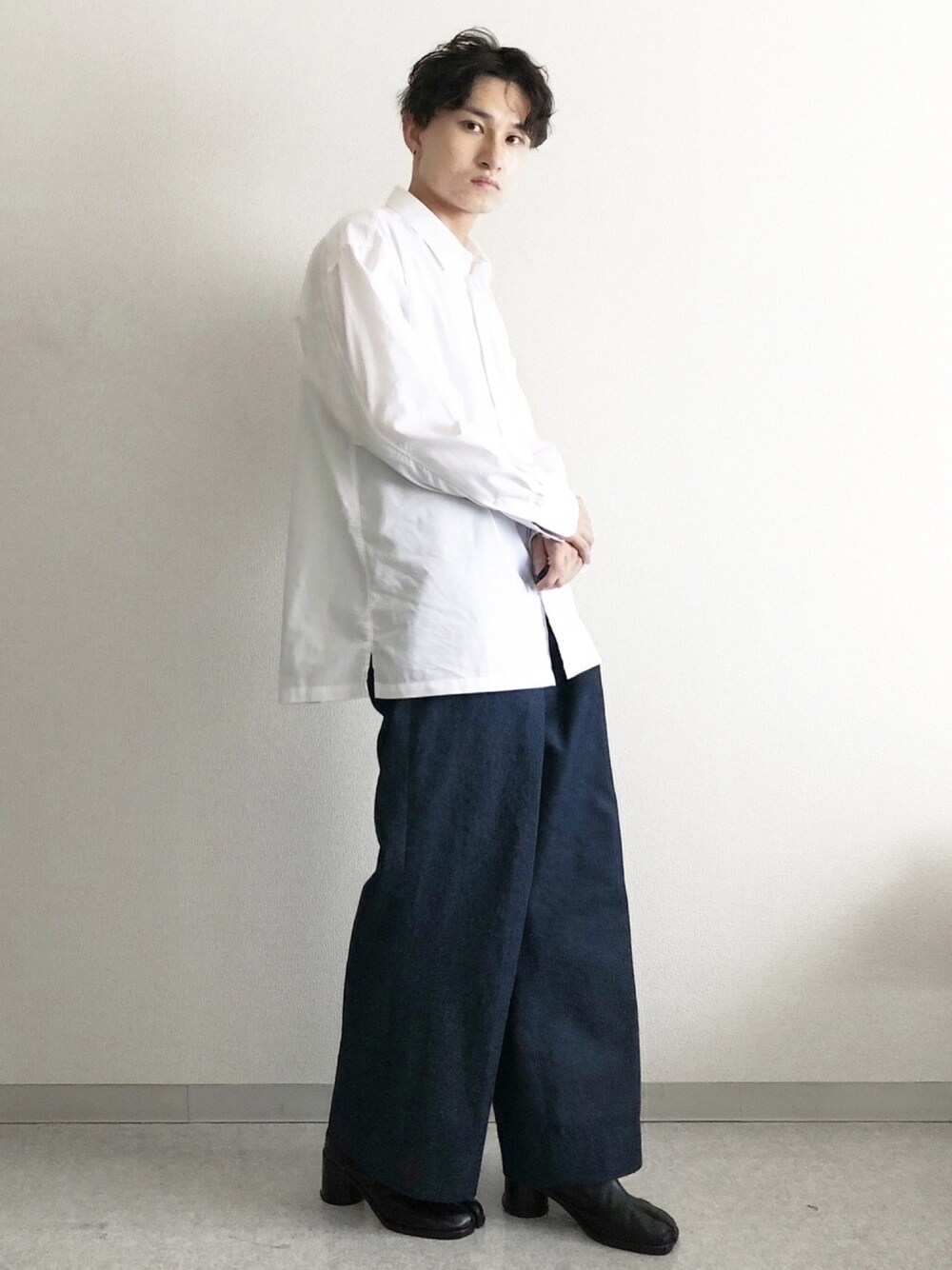 UNIQLO × JW ANDERSONの白シャツとJOHN LAWRENCE SULLIVANのワイドデニムを使ったコーデです!! 久々にユニクロでインナー以外の服を購入しました😆 オーバーサイズのシャツなので抜け感のあるコーデにおすすめです✨✨