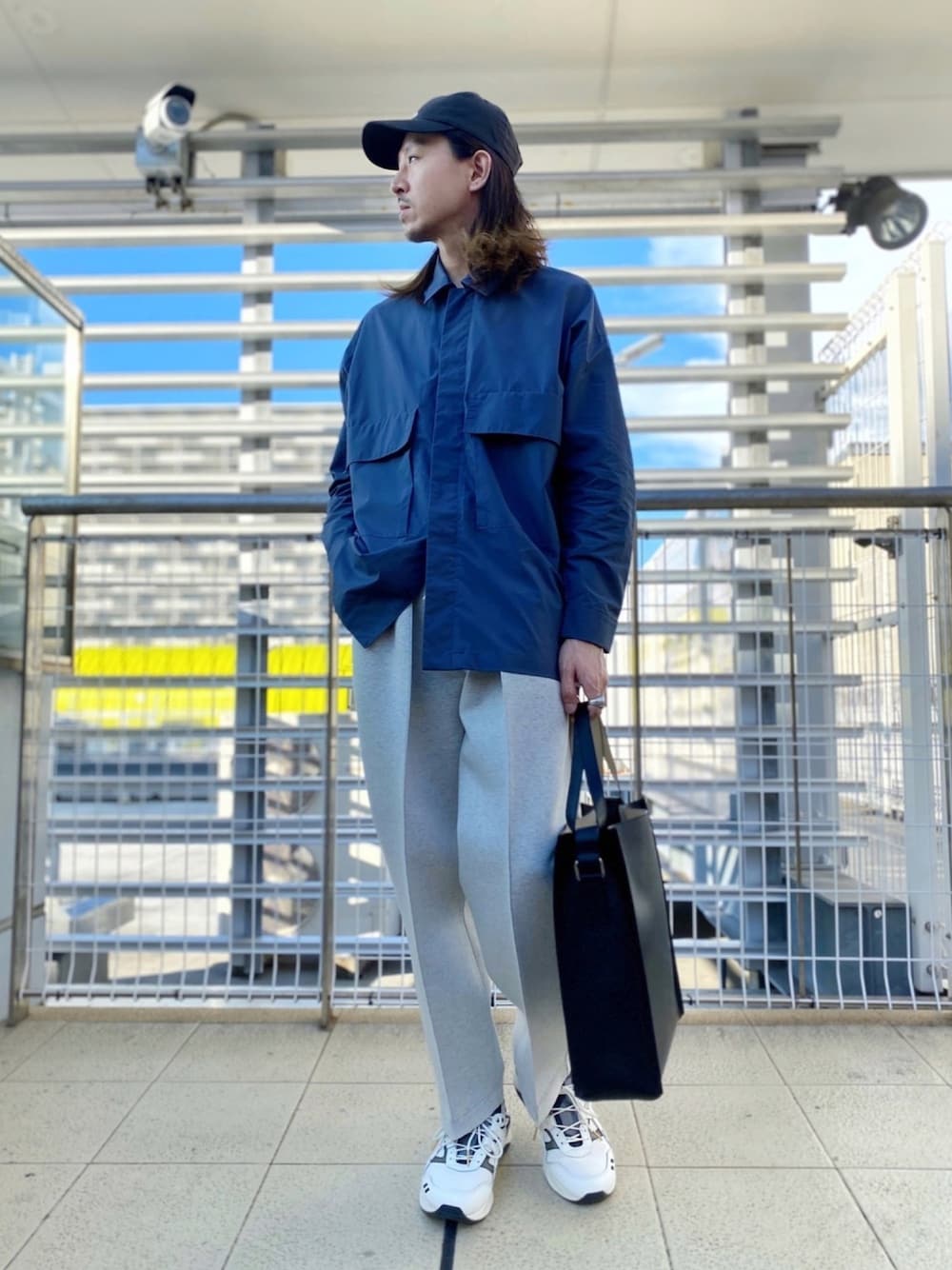 ブルゾンライクなデザインが特徴のシャツに、イージーパンツとスニーカーを合わせたカジュアルスタイルです! バッグはトートとショルダーの2WAYで使えるので使い勝手も◎