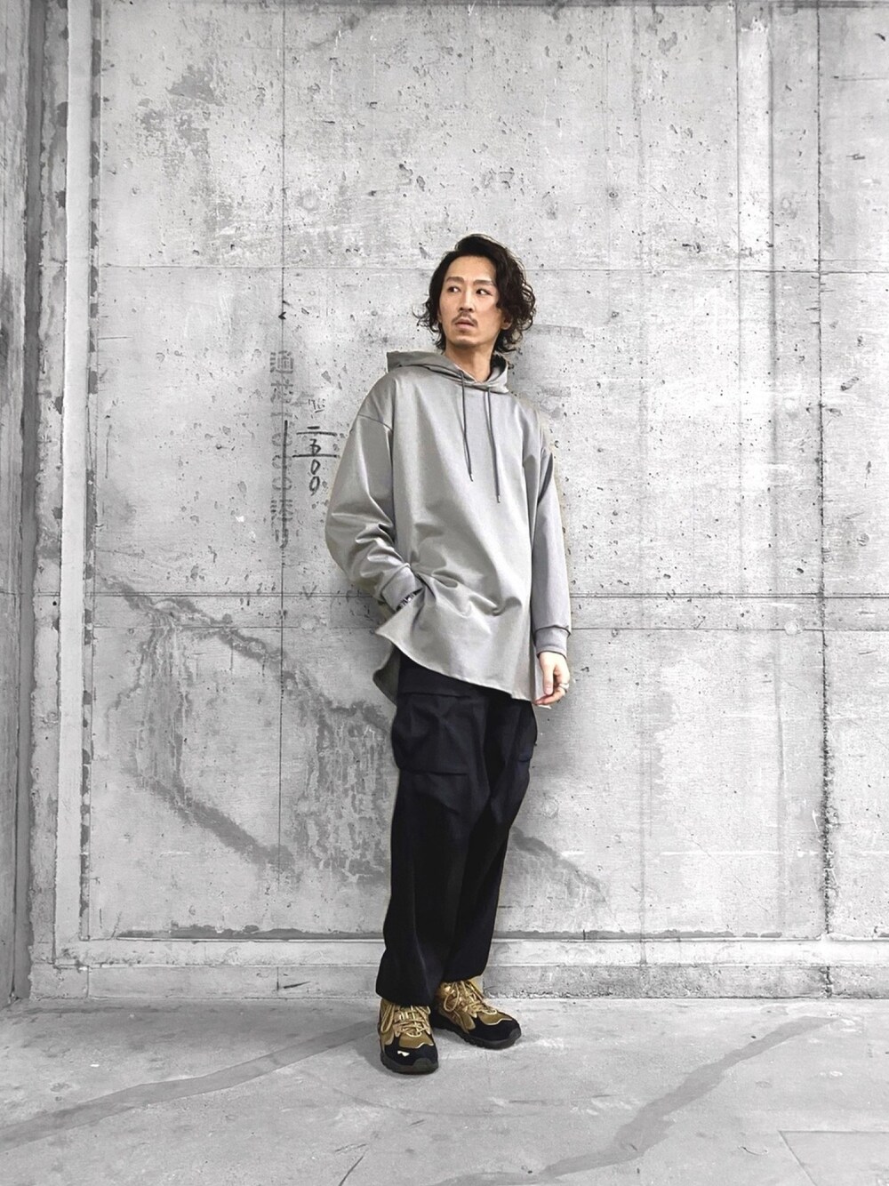 新作のウルティマスリットフーディーをメインにスタイリングしました。 カットながらハリのある素材なのでフードの立ち上がりも◎サイドのスリットと着丈長めのオーバーサイズがポイントです!