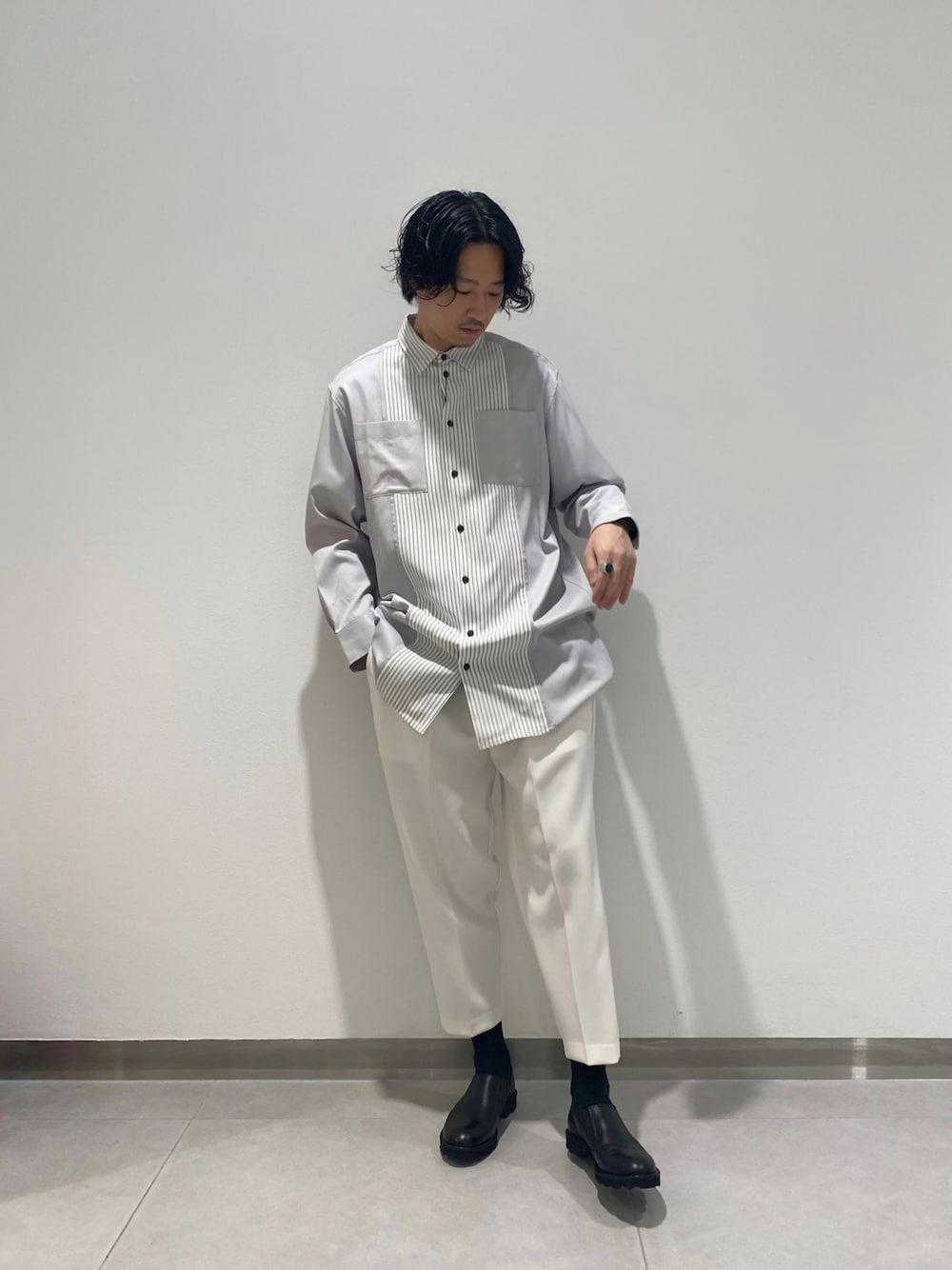 きめすぎないワントーンコーデで春らしさを意識しました。 切替デザインが映えるロングシャツとホワイトのアンクルカットのスラックスで爽やかコーデです!