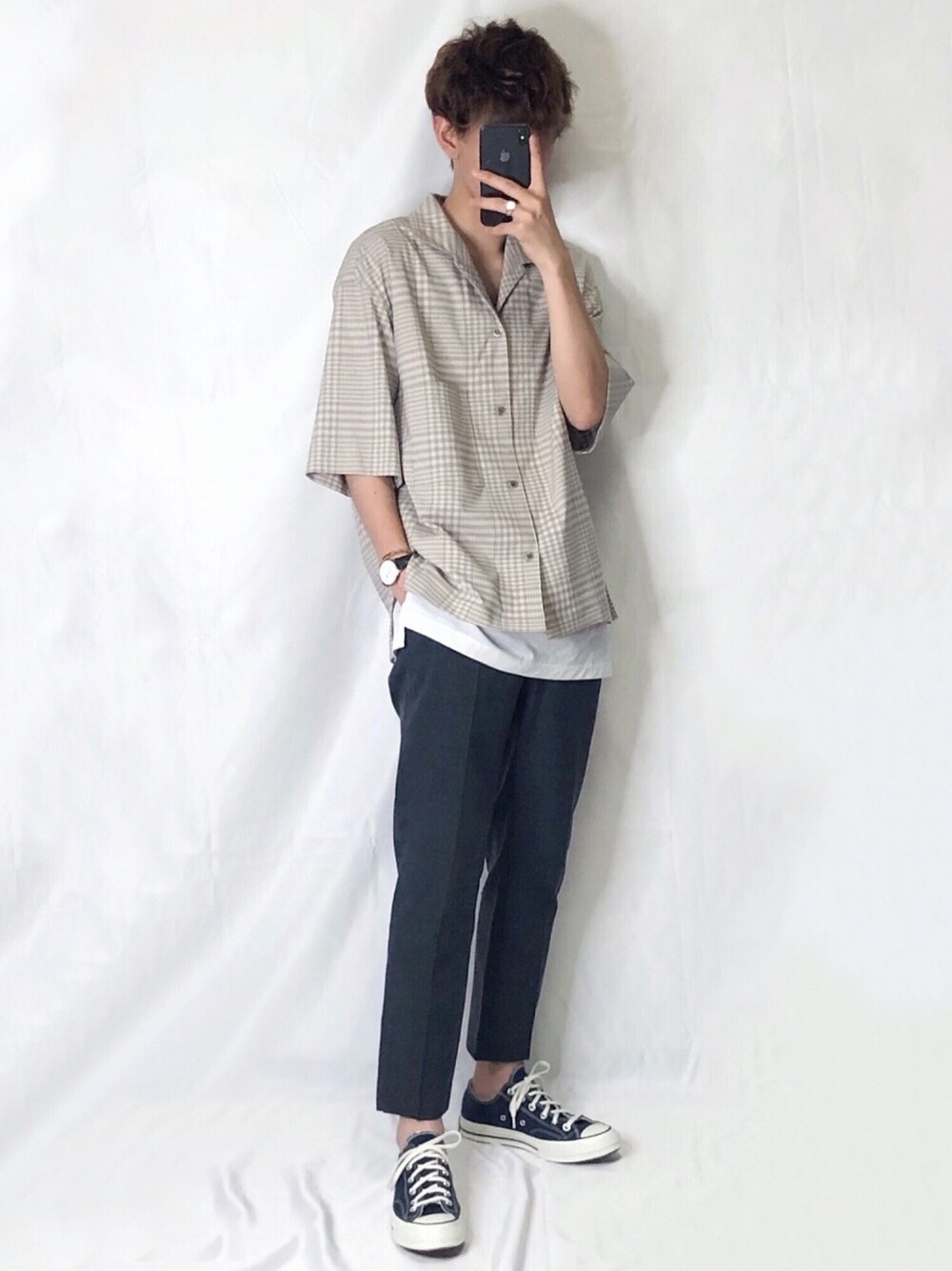 トレンドのチェックシャツコーデ🔥 ベージュを選ぶ事でより今季らしさを出す事が出来るのでチェック選ぶ時はベージュやブラウンをオススメしますー!!! テーパードのスラックスと合わせる事でよりシルエットがキレイに見えスタイルも良くみえるので是非レイヤード+テーパードを意識してみてくださいー!!! 足元はコンバースにする事でキレイめによりすぎずに上手く中和することができます👍