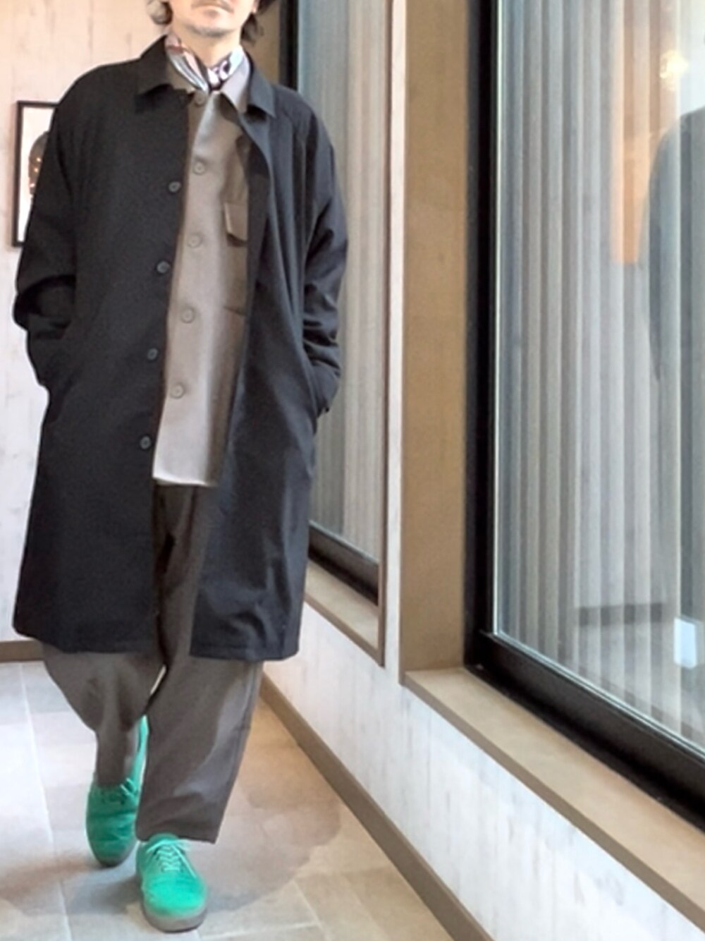 今回はセットアップです。 以前から結構着てるのですが… 普通に着てしまうとアレなんで… ちょっとスカーフを仕込んで。。。 鮮やか足元で外してみました。。。 という具合です。 今回は 黒のステンカラーコート3連チャン予定です。 では。 今日はこのへんで。