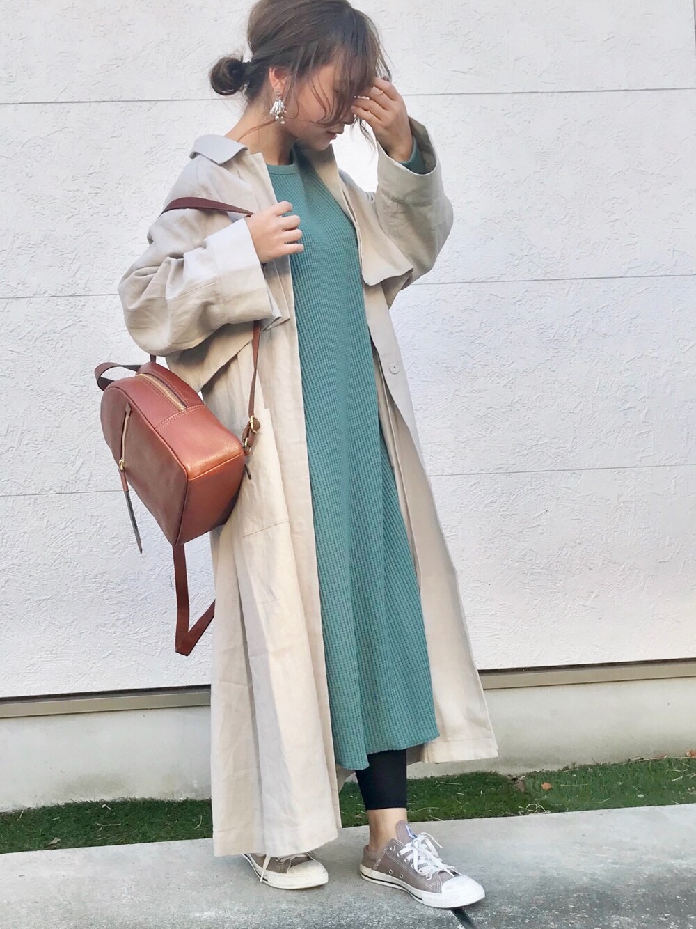 着回しコーデ🧚♂️🧚♂️ くすみグリーンにベージュは ナチュラルな印象で大好きな 配色🤤🤤💓 ワンピの羽織りってつい ショート丈で合わせてしまいがちだけど ロングコートをばさっと着ても可愛いです🥺🥺 Instagram ➡︎ taiyou_125 🌻✨