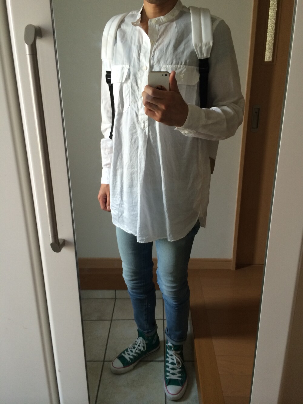 スニーカー:コンバース UNUSEDのロングシャツに TOPMANのブリーチデニムを合わせて、 コンバースのスニーカーで色をつけました。