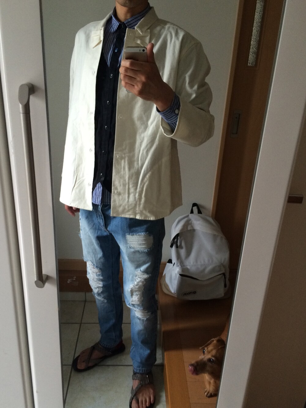 デニム:21 サンダル:ナノ パジャマシャツを シャツジャケットにしてみました。 ルーちゃん写り込み ( ●•́ ਊ •̀●)