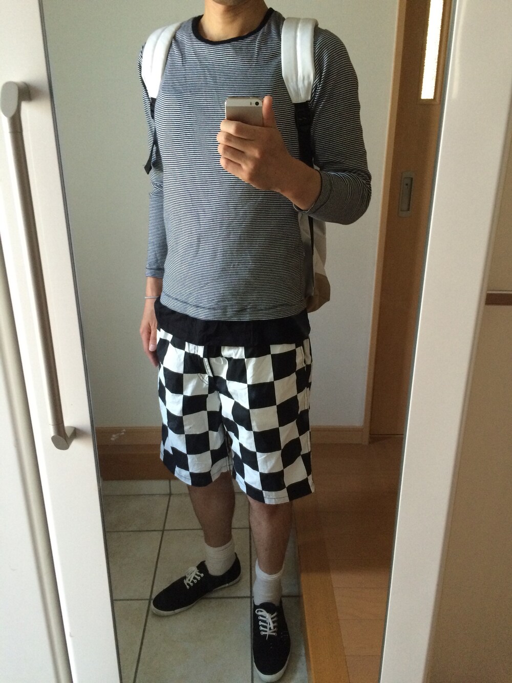 カットソー:UNIQLO タンクトップ:21 チェッカーのパンツに 細ボーダーのカットソー 合わせました。 (●`ω´●)