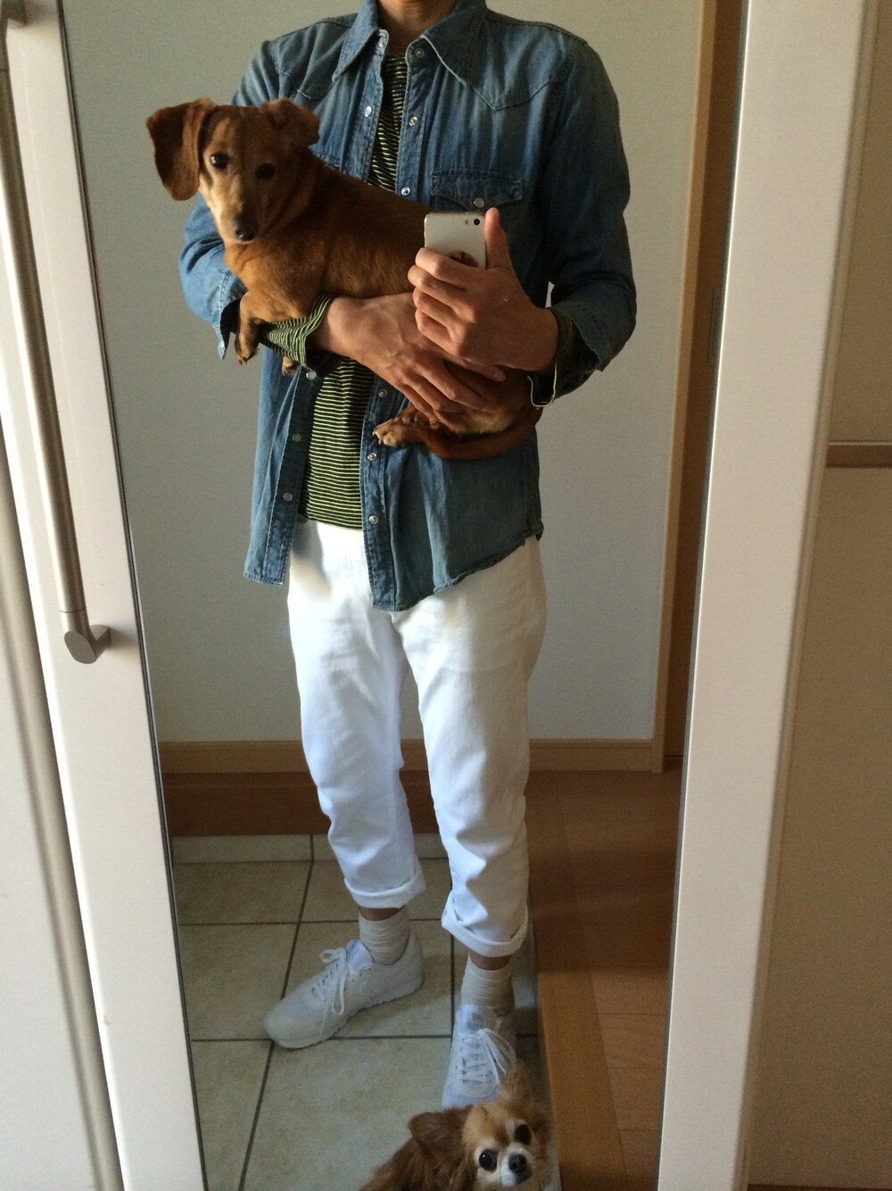 シャツ:アーバンリサーチ デニム:UNIQLO スニーカー:ニューバランス 愛犬と過ごすGW