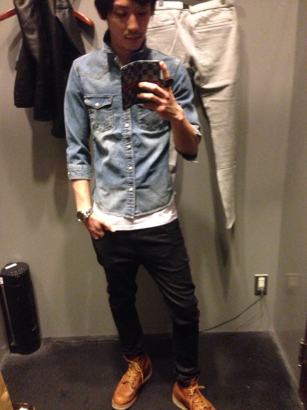 ナノユニバースさんの試着室にて! デニムシャツは一目惚れです笑 7分丈大好きです!