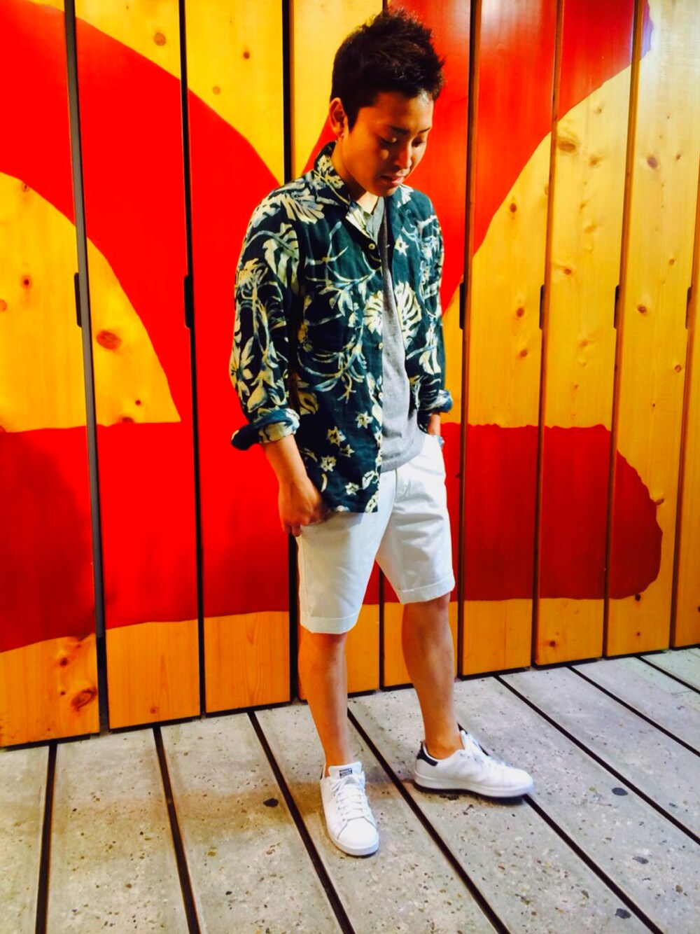 夏の花のモンステラ柄シャツにホワイトのショートパンツコーディネート! インナーにはお気に入りのグレーの45RならではのTOP糸(綿から染めてるからこその霜降り感)VネックT-SH!!