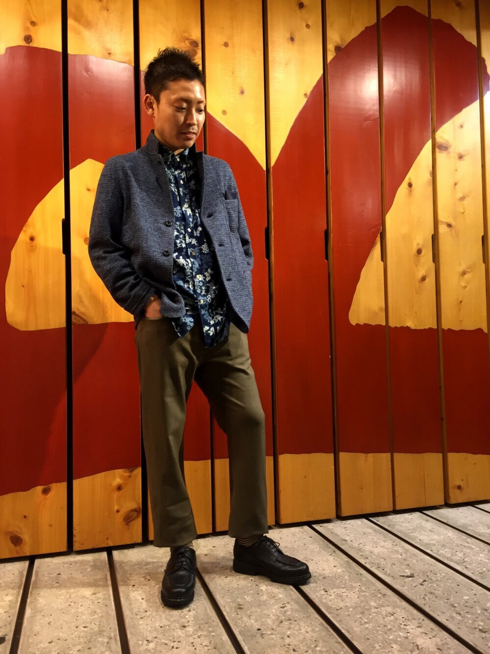 45Rならではのインディゴ抜染シャツに綿ウールのニットジャケットで合わせた"柄×柄"スタイル!! ボトムスにはカーキのウールパンツで爽やかな秋感を出してみました!! お気に入りのコーディネートです!!