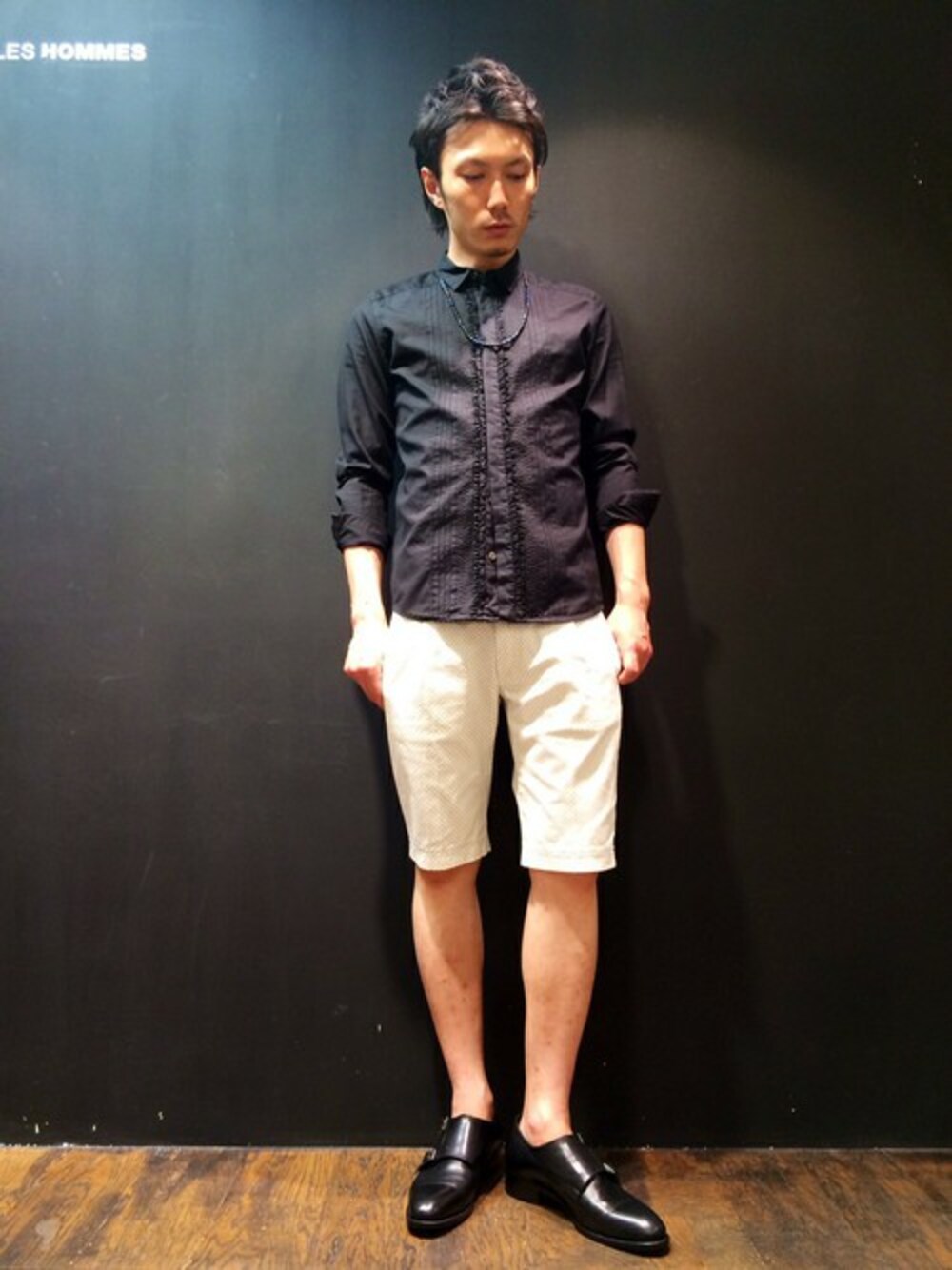 キレイ目な白ショーツを合わせました。 足元はダブルモンクでドレッシーな雰囲気を 演出したシンプルなスタイリングです。