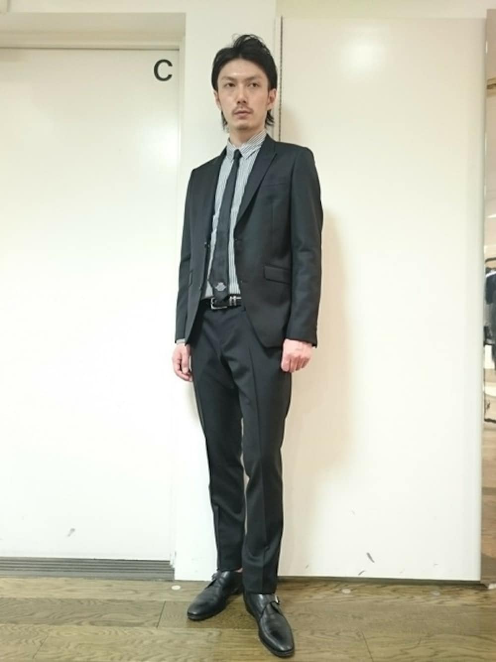 ナチュラルストレッチ性のある 定番セットアップになります。 インナーはストライプシャツで清涼感をだしました。 ネクタイは黒でシックに演出。 足元はモンクでシンプルにスタイリングしてみました。