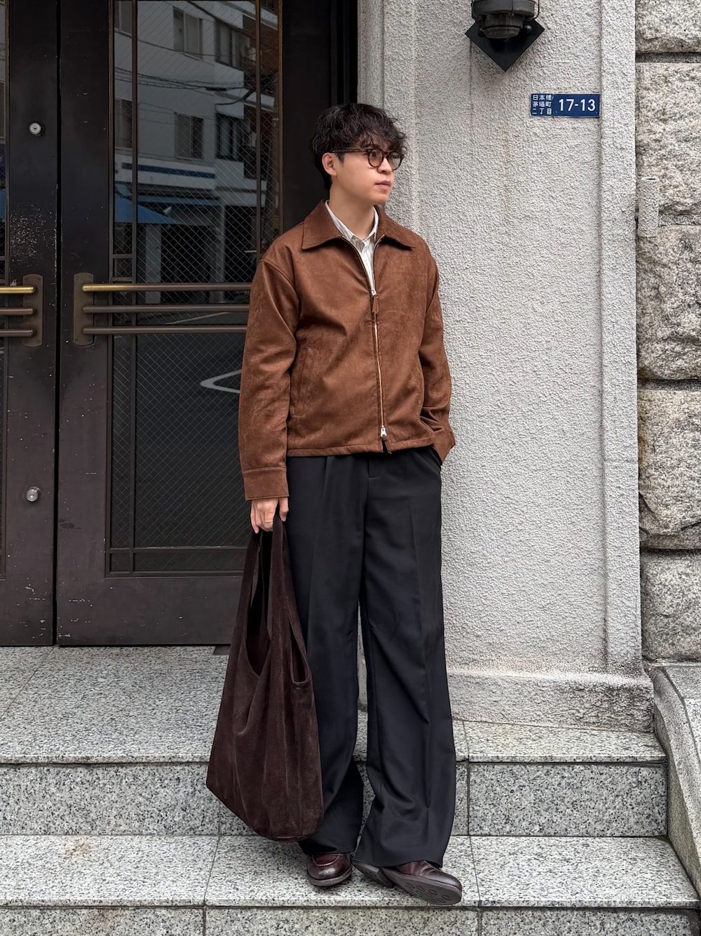 Takamitsuのブルゾン「【LURAKU】Synthetic Suede Zip Jacket / LURAKU シンセティックスエードジップジャケット」を使ったコーディネート