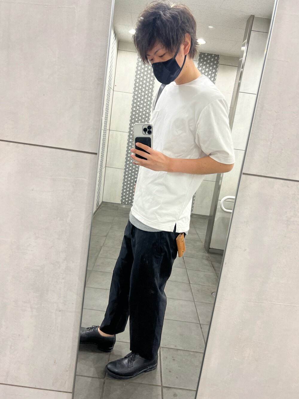 夏はシンプルに白Tシャツと黒いボトムでまとめてみました。 腰のキーケースは自作で、腰から下げれるリアルウッドの本革コインケースです。