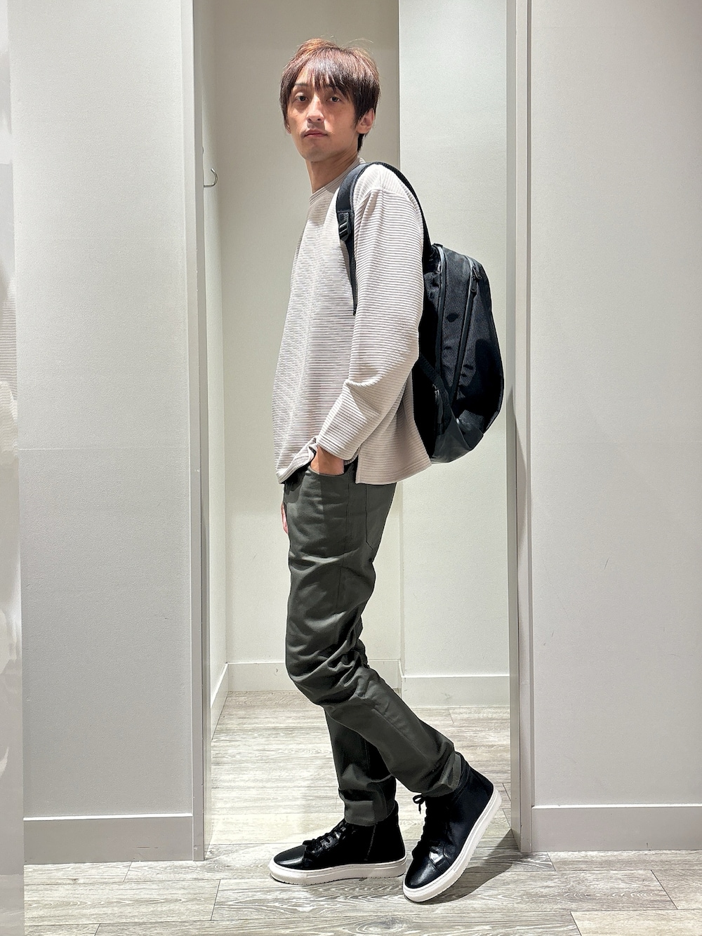 ★たか★(アバハウスルージュヴィフラクレ三井アウトレットパーク 滋賀竜王店(MEN'S))のTシャツ/カットソー「【AH ABAHOUSE】リップルボーダー 長袖Tシャツ」を使ったコーディネート