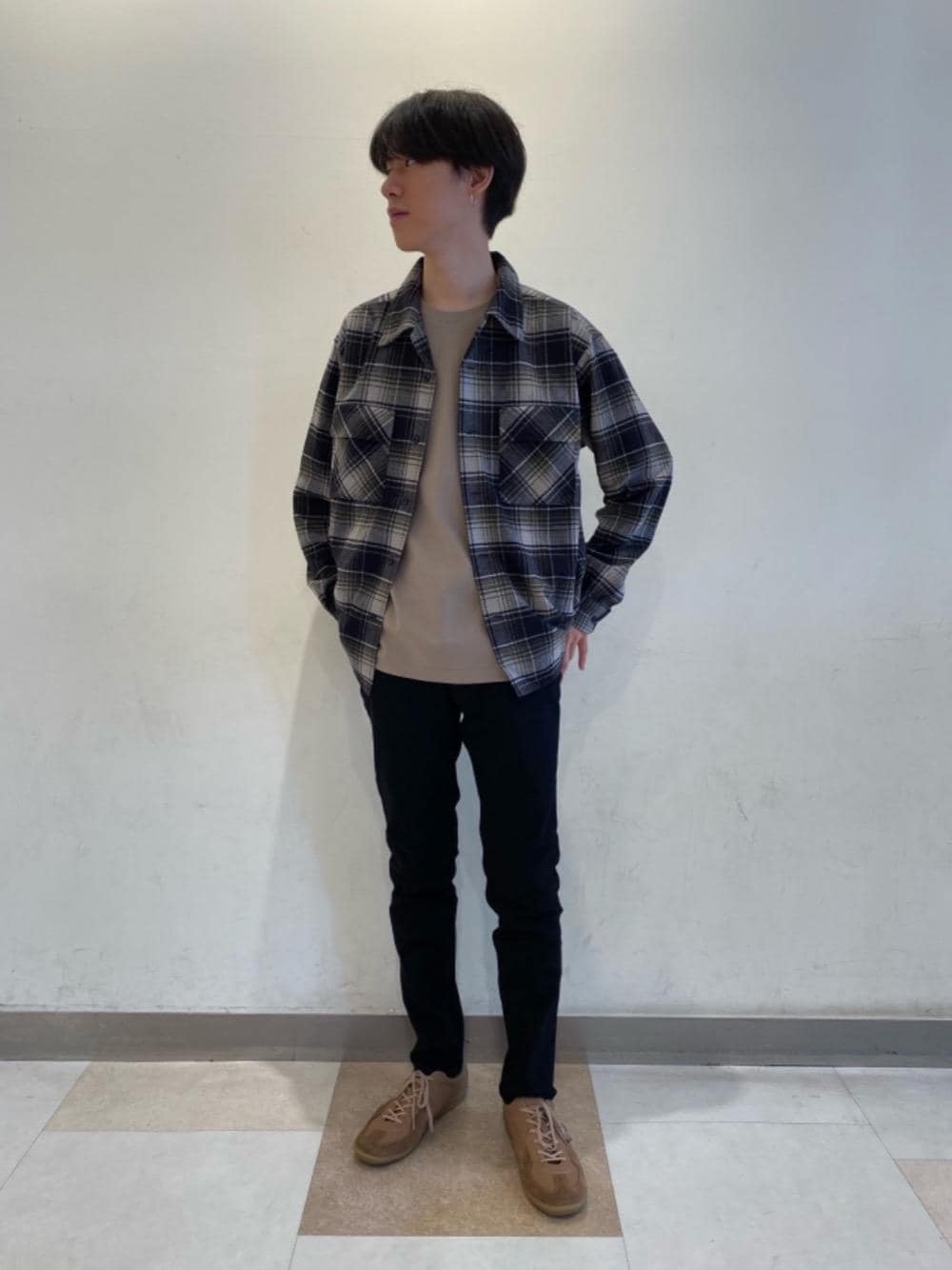 身長:177㎝、着用サイズ、:ジャケットL、:インナーL、:パンツL、:シューズ43 ペンドルトンのチェックシャツを軸に、秋感あるブラウン色でまとめた、まとまりあるコーディネートです。