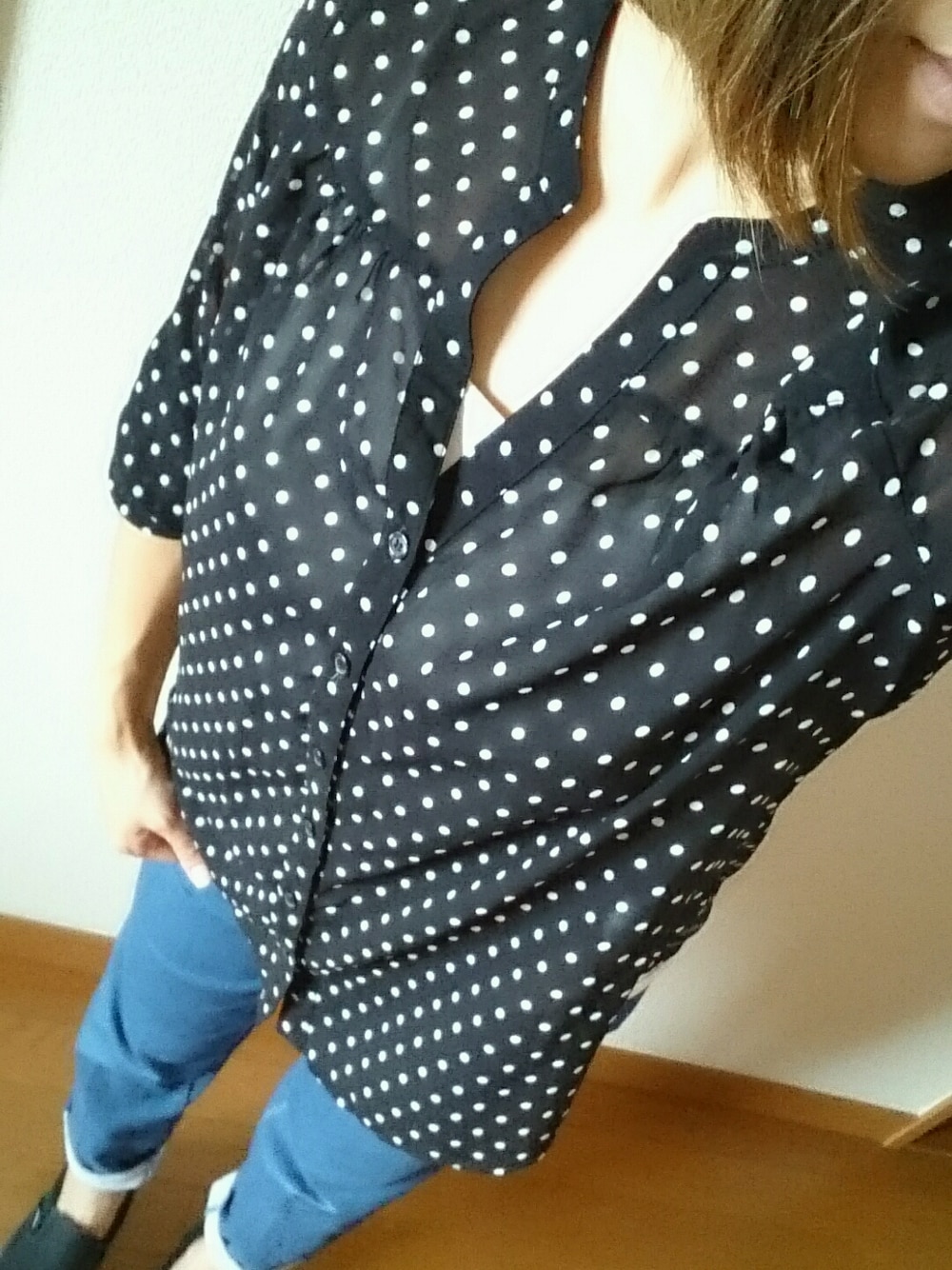 しばらくぶりの投稿! 水玉ブラウスは4年目くらいかな!? 形、質感が良く、この時期にピッタリの優秀トップスです。 パンツはストレッチしまくりデニムテイストパンツ。なんとも動きやすい!