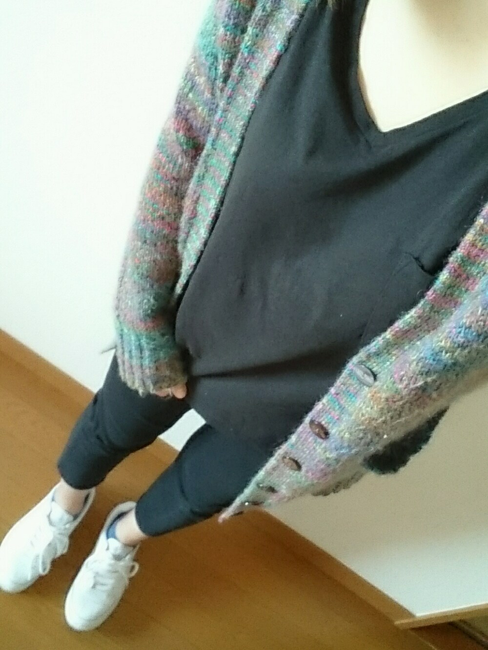 いつも通り ブラックをベースに 3年ものカラフルニットカーディガンと vansの白スニーカー。 年齢的にこのカーディガン そろそろ厳しいかしら…。
