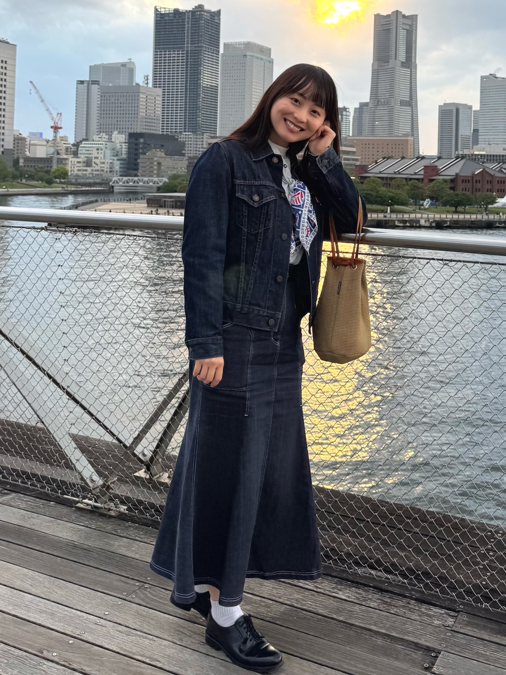 バンダナを主役に、デニムオンデニムでまとめました。バンダナはたすきがけのように結んでいます^_^色がきちんとそろっていれば違うブランドのデニムあわせでも意外とあいます^_^このロングスカートのときは短めなソックス、ローファーを合わせて少しすっきり&歩きやすくしています。