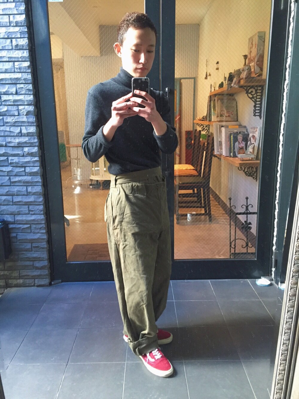 USEDの太めの空軍のパンツに、ポイントとなる赤のスニーカーを合わせました