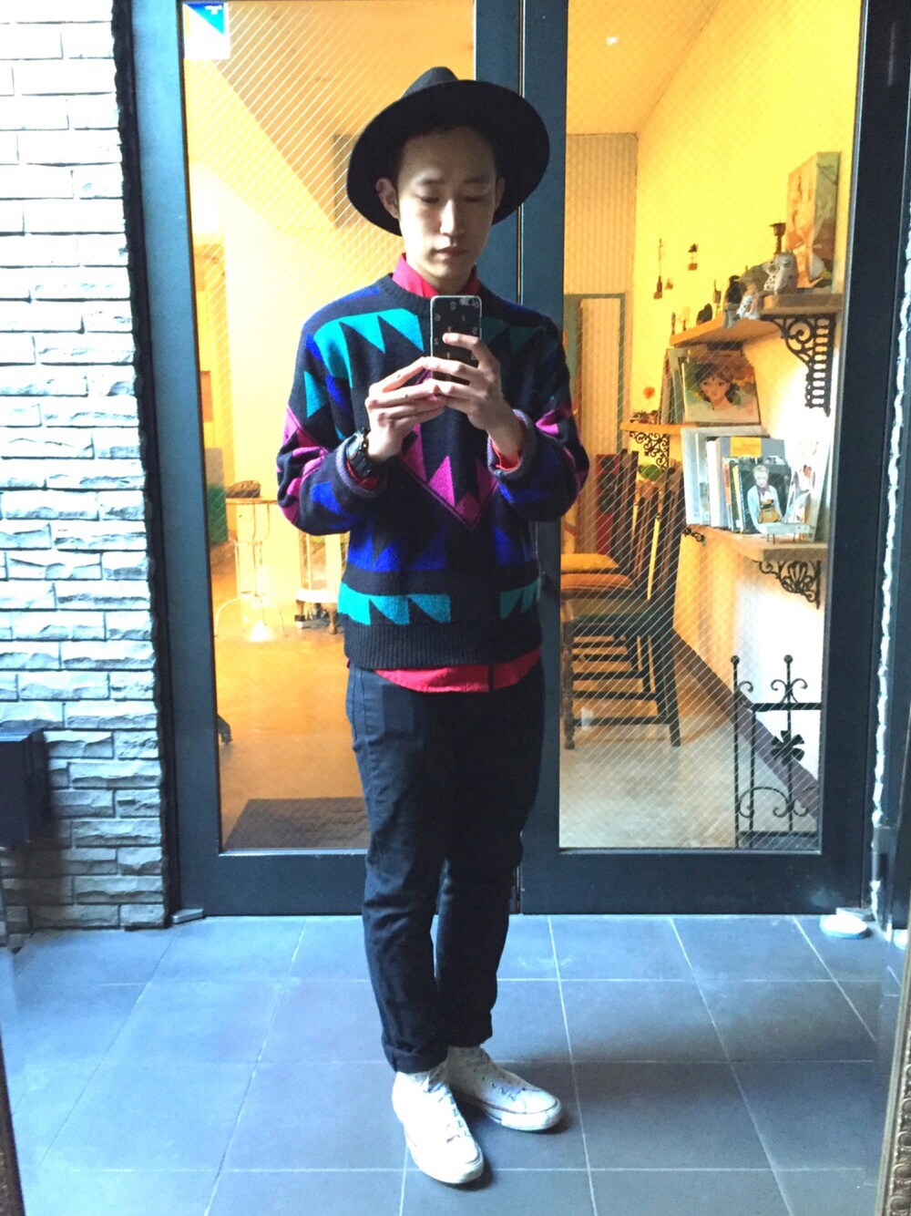 アールデコ柄のニットにポイントとなる赤のシャツを合わせてコーディネートしました