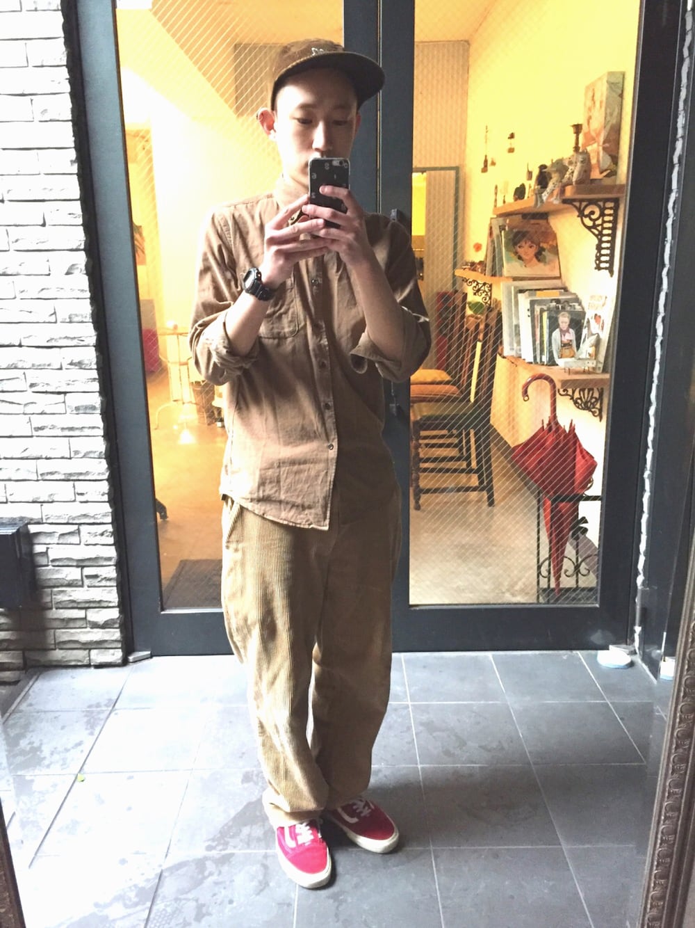 ベージュなどの同一系に、ポイントとなる赤のスニーカーを合わせてコーディネートしました