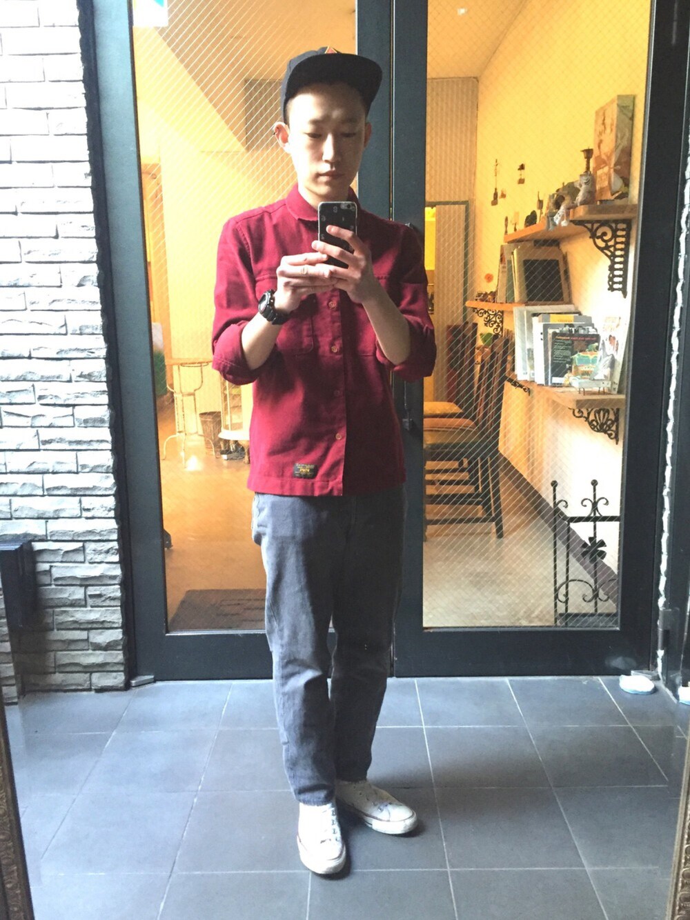 赤のウールシャツをポイントに、usedのデニムパンツ、ALL STAR、キャップとストリートにコーディネートしました instagram→takahiro_bt