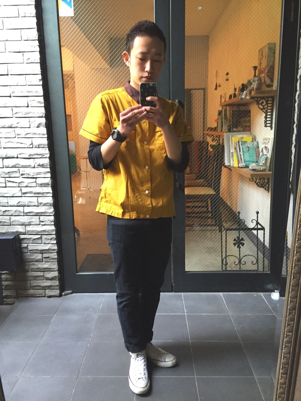 細身のパンツにALLSTAR、ポイントとなる黄色のボーリングシャツを合わせ、ウェットなスタイリング剤でスパイキーにスタイリングしました instagram→takahiro_bt