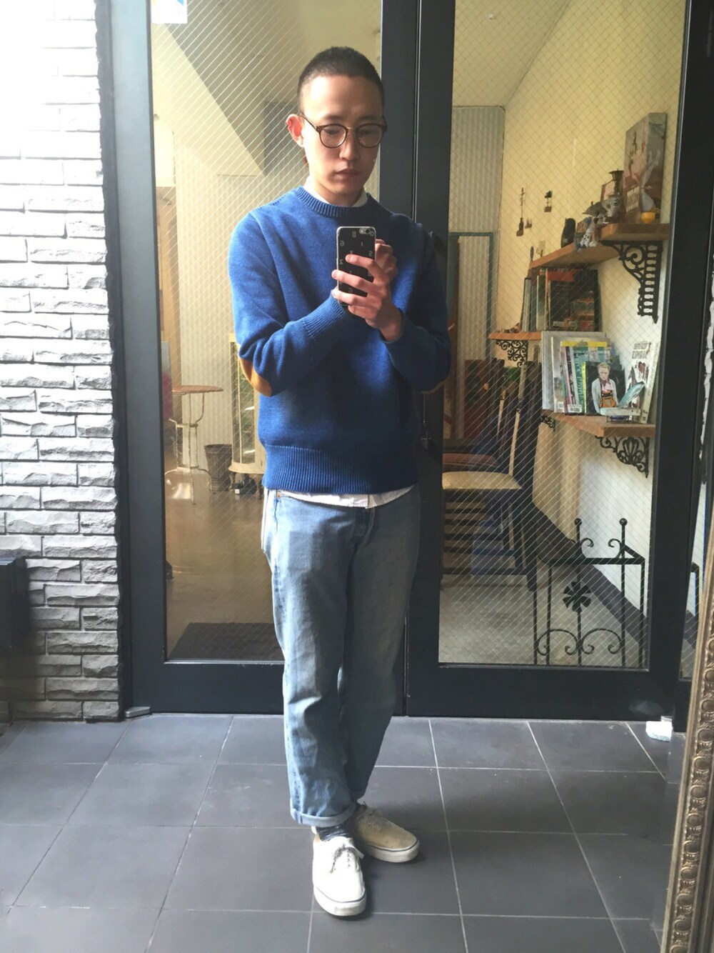 ポイントとなるブルーのTHE NERDYSニットに、春っぽく淡い色合いでコーディネートしました instagram→takahiro_bt