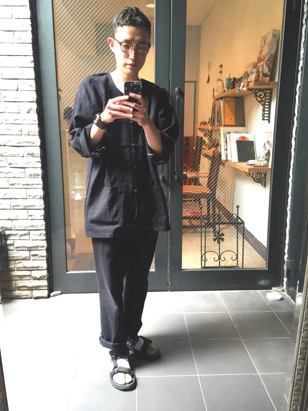 黒を中心に、デザイン性のあるチャイナシャツ、足袋ソックスを合わせコーディネートしました。