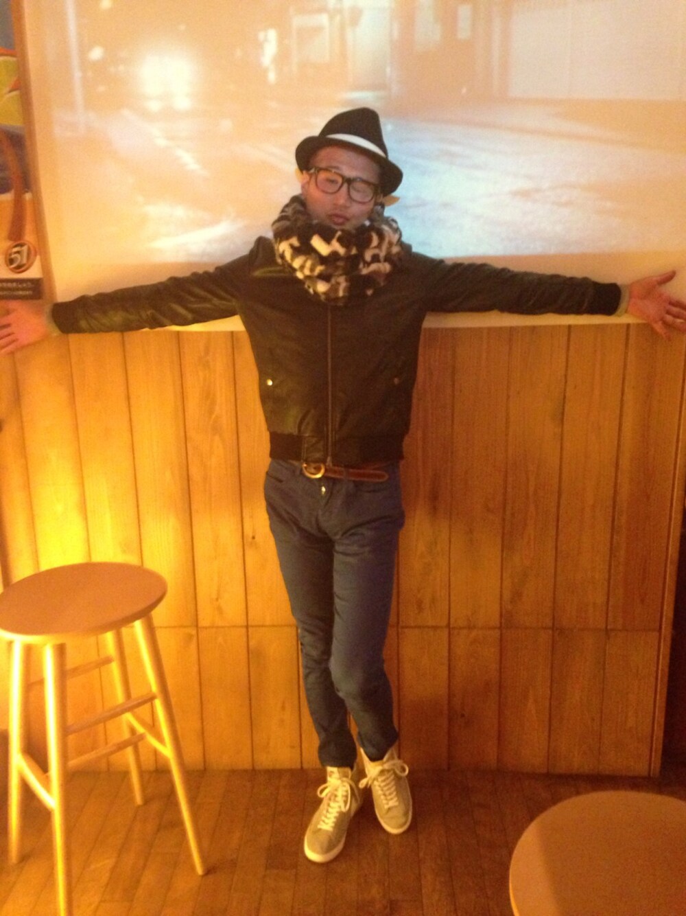 黒のライダースがハードになりすぎないよう ブルーのパンツとスヌードでPOP感を出してみました。