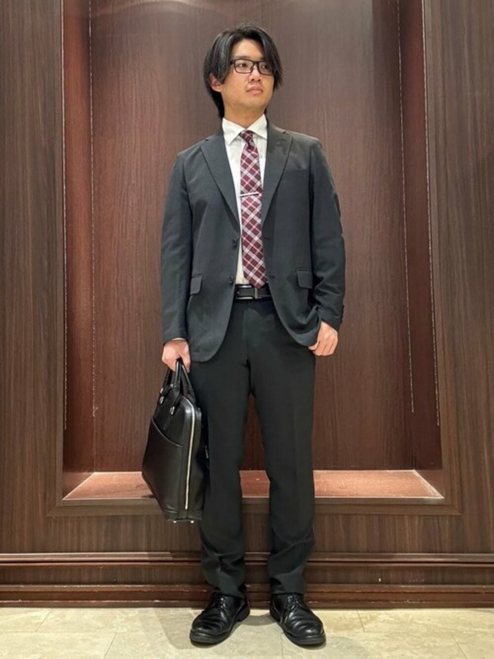 ビジネスコーデです! スーツはAIRモデルのストレッチ素材! COMPACT、MUSCLEと比べても肩パッドが薄く軽い着心地◎ こちらは背中、袖にも裏地の入っていない仕様で夏でも快適に着られます! ネクタイはマシンウォッシャブル対応のエコウォッシャブルタイ! 明るすぎず、暗すぎないワインはブラック、ネイビーのスーツとも相性◎ ベルトは穴のついていないアジャストフリーベルト! ミリ単位での調節が可能でよりフィット感のある付け心地です◎ バッグはA4サイズ対応の2wayブリーフバッグ! 付け外し可能なショルダーベルト付きです!