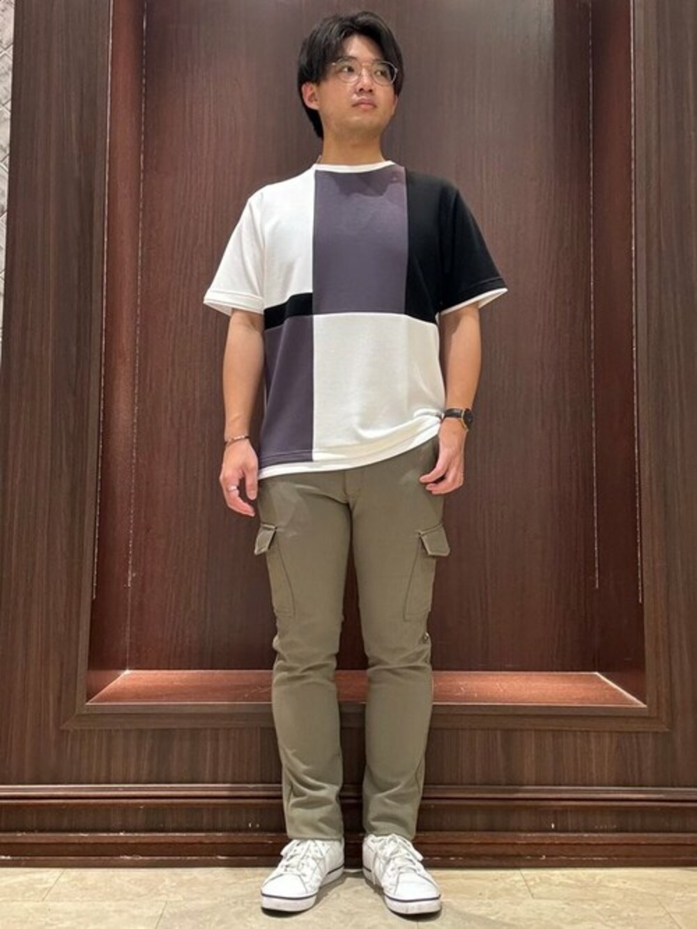 カジュアルコーデです! トップスはインパクトのある切替カットソー! ストレッチが効き、シワになりにくく、型崩れもしにくい機能性素材◎ 袖、裾はフェイクレイヤード仕様です! パンツはクロスストレッチのカーゴパンツ! 接触冷感機能付きのクールタイプです! クロスストレッチシリーズといえばのストレッチ性で動きやすさ◎