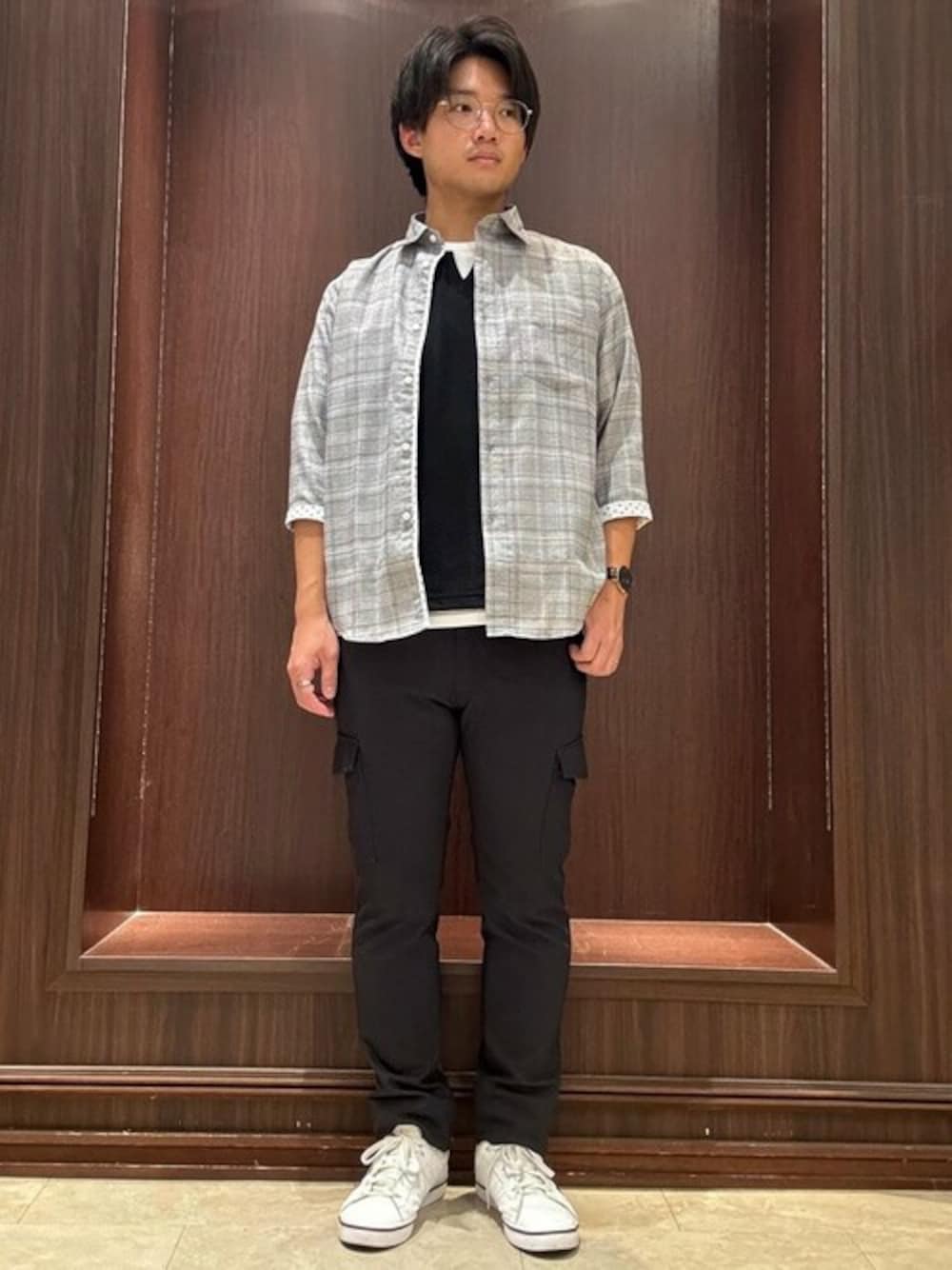 カジュアルコーデです! シャツはレギュラーカラーの七分袖シャツ! ポリエステルと綿の凹凸感のある生地でさらっとした着心地◎ 汗を吸って乾かす吸水速乾に優れた素材です! インナーは一枚でさまになるフェイクレイヤード! 襟、袖、裾に身頃とは別の布を合わせたTシャツで Tシャツの上からベストを着たような見た目のデザイン◎ 身頃部分は凹凸感のあるジャガード織になっています! パンツはクロスストレッチのカーゴパンツ! 接触冷感機能付きのクールタイプです! クロスストレッチシリーズといえばのストレッチ性で動きやすさ◎