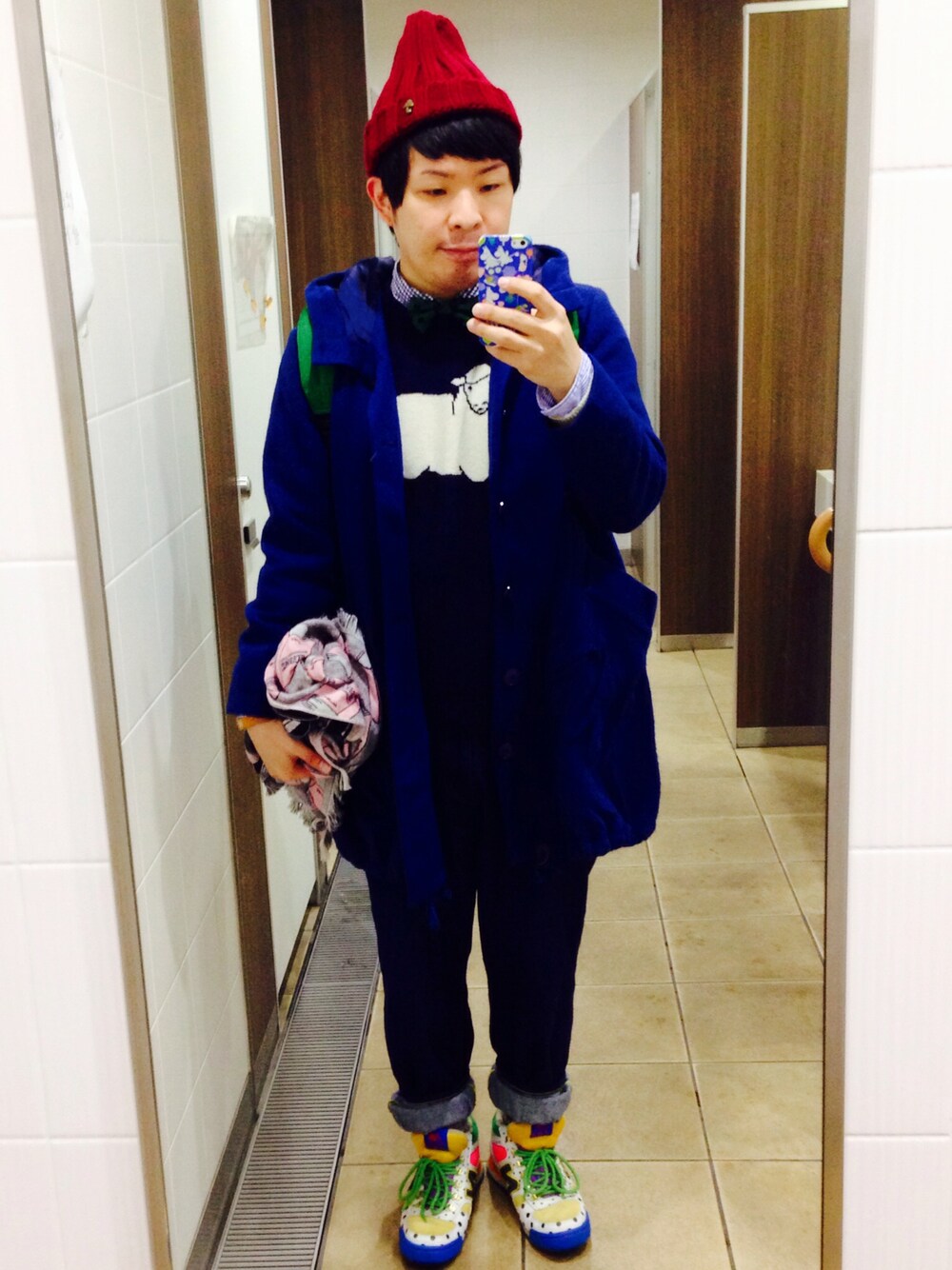 今日のたかやん☆ IamIのヒツジニット買ったから着た〜! コートはネネットで結構前の(^_^;) ポケットが手袋の形してるの(≧∇≦) 全体的にネイビーでまとめたからリュックやストールの小物に色入れた!!