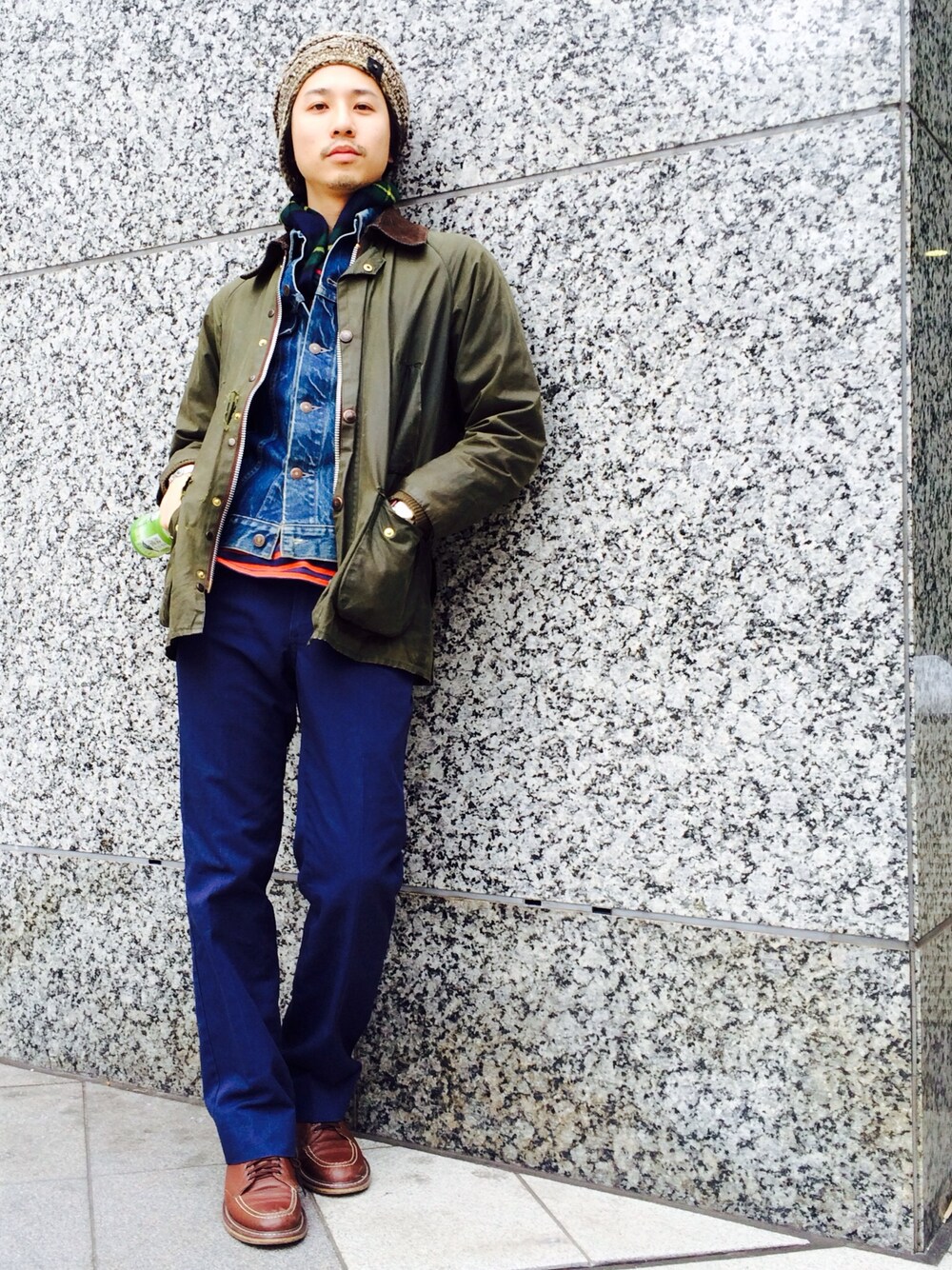 マフラーの色と時計のラクジュアリーさとオールデンのインディーブーツで、小汚さをカバー。 更に、クリースパンツでスマートさを演出。 Gジャンのレイヤードが今の気分ですわ。 帽子:マウサウ マフラー:古着 ジャケット:バブアー インナー:ビッグE ビンテージ カットソー:オーチバル パンツ:古着 シューズ:オールデン