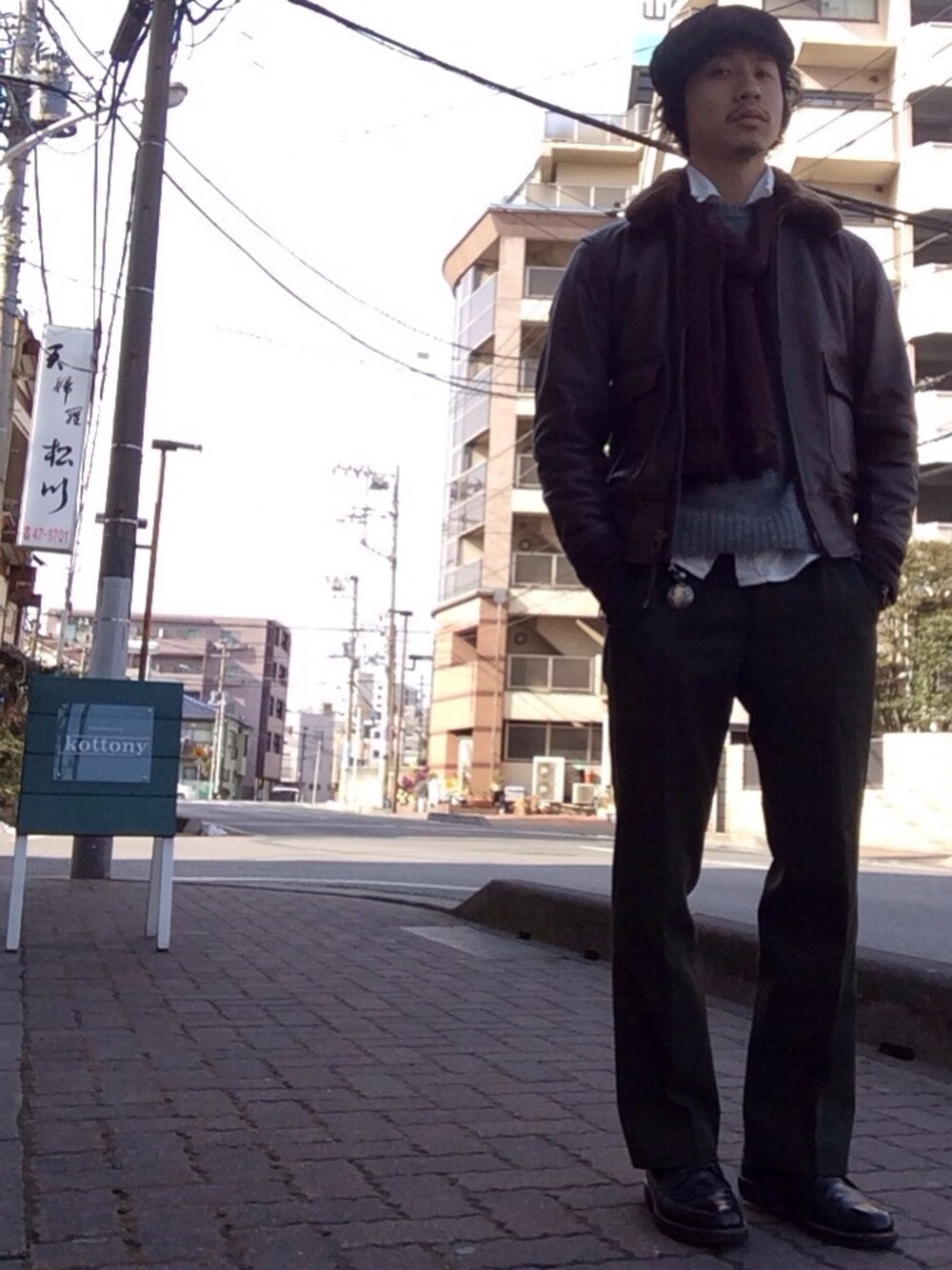 コットニーの前にて。 落ち着いた色使いと、キャス、レザー、ストールで大人な男を前面に押し出したコーディネート。 。。色わかりずらいな。 キャスケット以外古着!!!