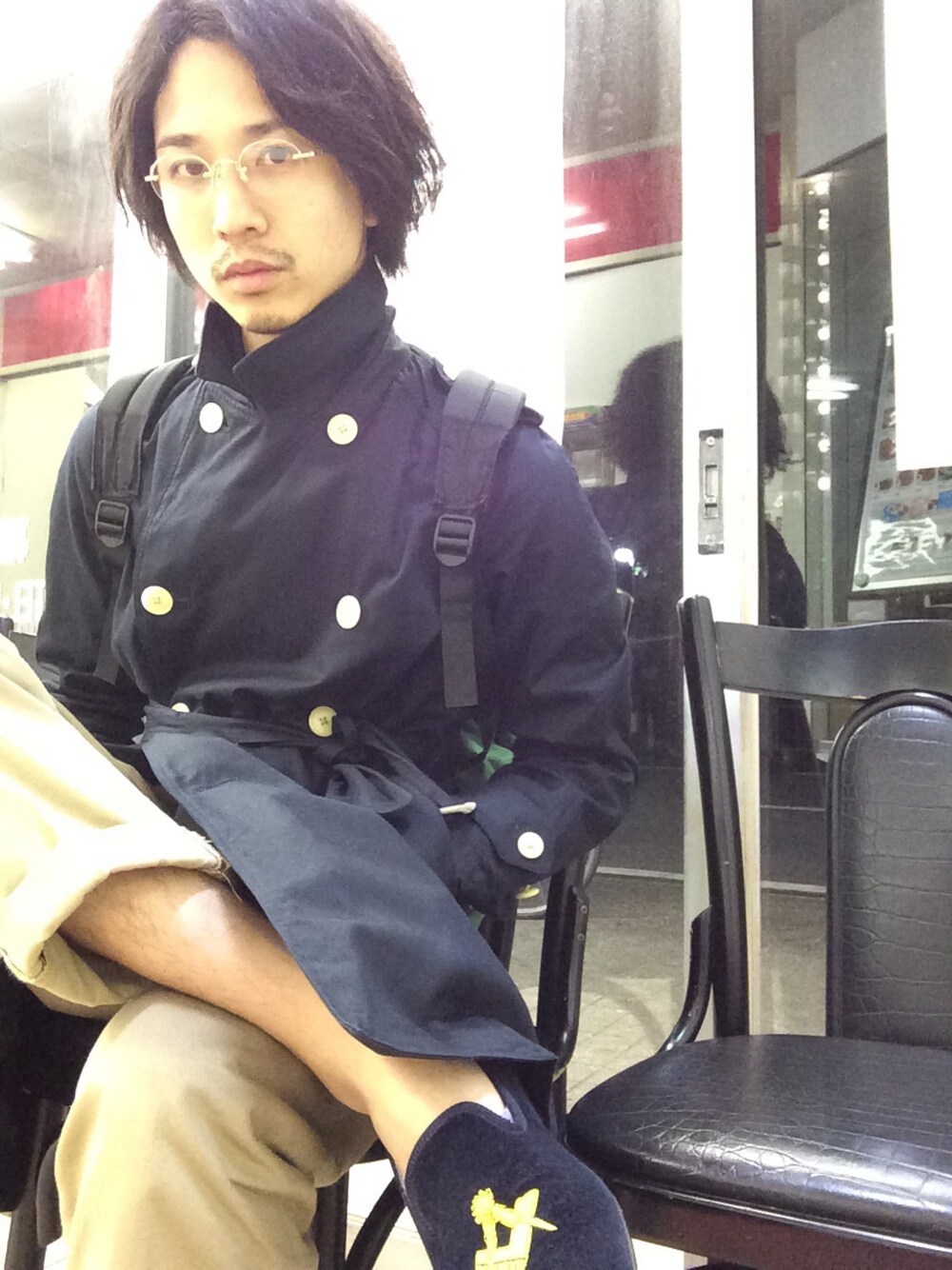 弁当屋仕様。 トレンチを上まで閉めて襟を立ててモードっぽく。 足元トリッカーズで大人っぽく。 キメキメにならないように、パックパックでアクセント。 トレンチ:TOKITO パンツ:古着 シューズ:トリッカーズ