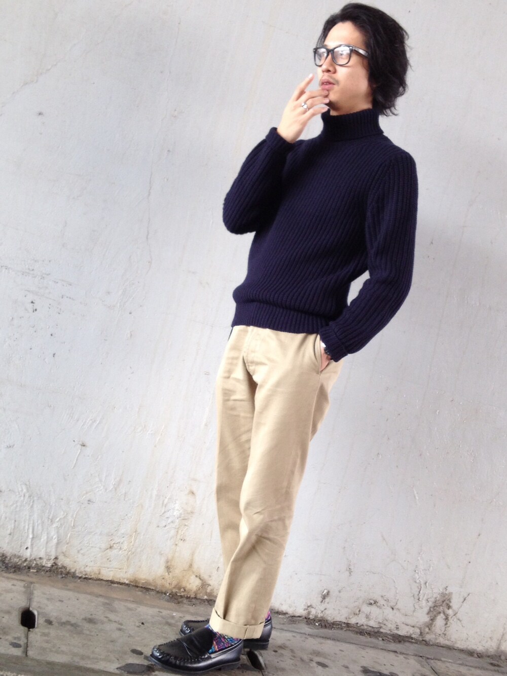 ACNEのローゲージにビンテージのチノ、60'sのローファー、70'sのレイバン。 今と昔のコラボ。