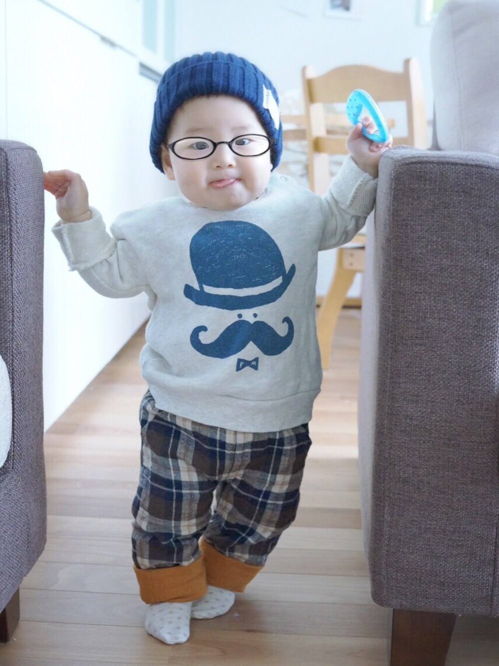 めがね、かけさせようとするも拒否されて断念💦 なのでメガネスタンプで😲 メガネに茶色×紺で知的な感じにしたかったのに、ポーズがなんかお間抜け。笑 小窓にはまだ抵抗できなかった頃のメガネショットを。。リラックマ×スーパーマン×グラサンと、なんとも怪しい赤ちゃんです。旦那の仕業😁