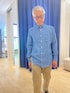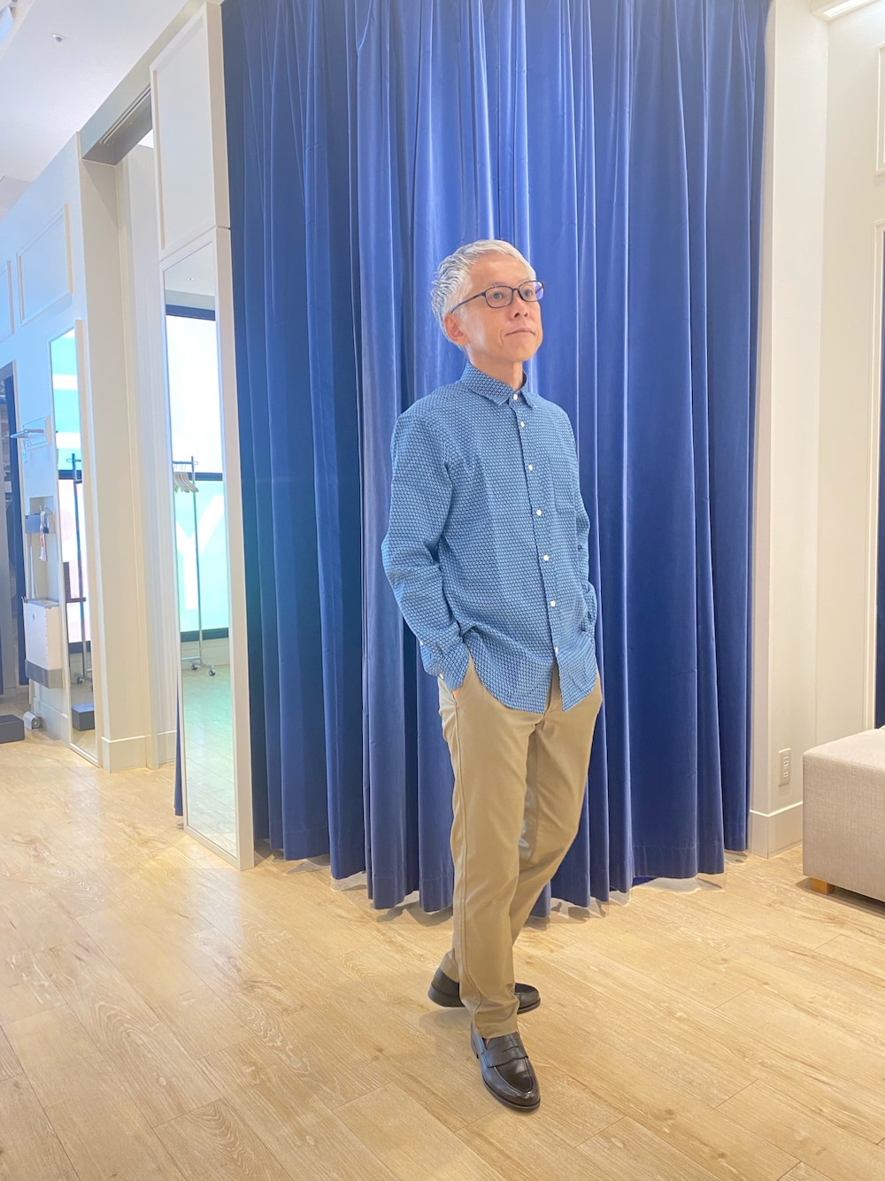 シルエットがキレイな定番チノパンツと表面微起毛レギュラーシャツの秋コーディネート。 ジャケット合わせでビジネスシーンでも使えます