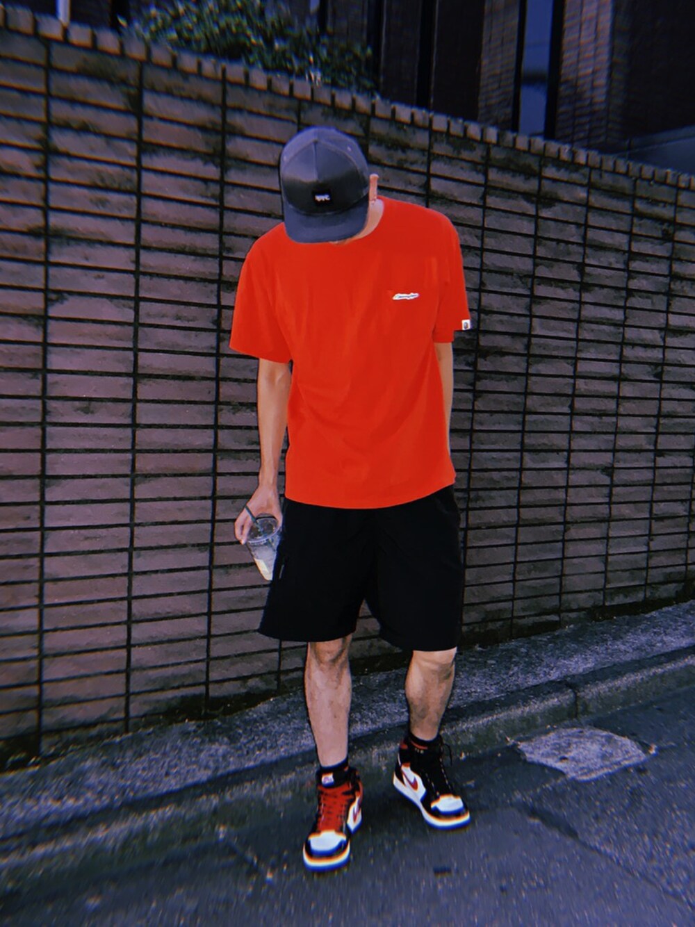 AJ1 gym redを使ったストリートコーデです! ハーパン履いて、靴下ちょい出しが好きなポイントです😊