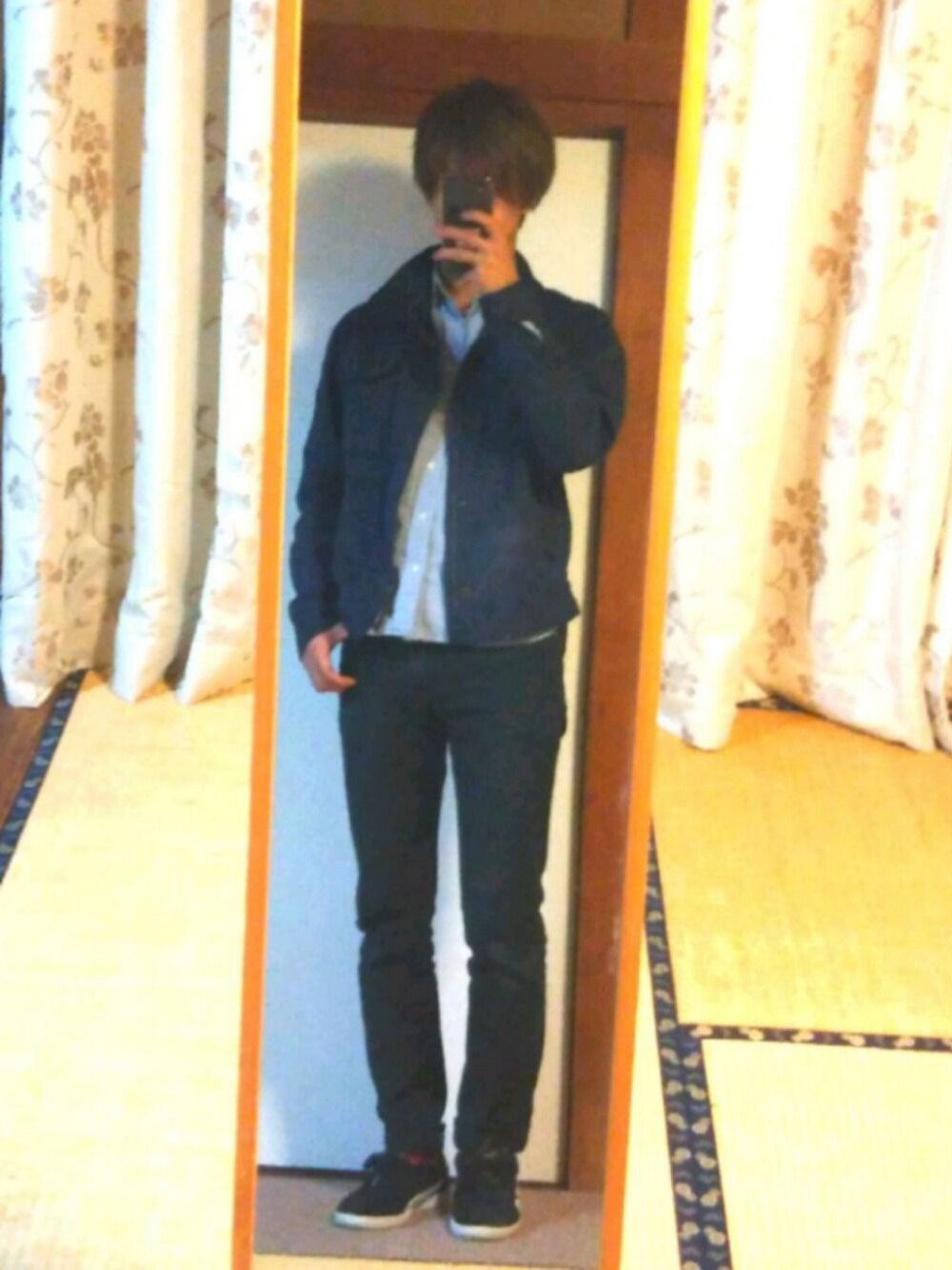 寒くなってきたので、長袖。 画像だとわかりづらいけど靴下には赤の差し色。 アウターはもらいもの