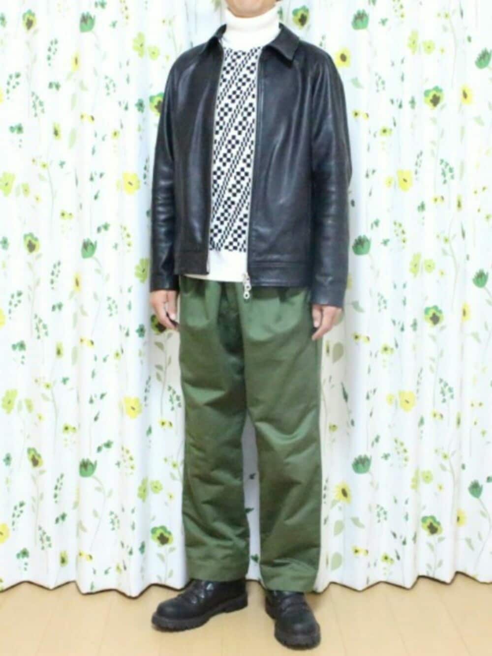 11/14(火) 最高気温 16℃ 最低気温 11℃ 天候:雨 雨で日差しがないため、気温より肌寒く感じる日。 レザーシングルライダース、ミリタリーパンツ、ブーツという無骨なアイテムを、ホワイトのタートルネックで品よくブラッシュアップした、男らしくも品があるスタイルを意識した。