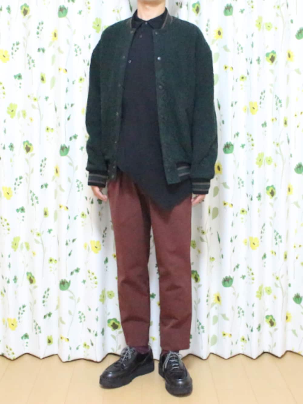11/21(火) 最高気温 12℃ 最低気温 4℃ 天候:晴れ 日差しが暖かいものの風の強さで体感温度は寒い1日。 シャツ・スラックス・革靴というきれいめなスタイルに、スタジャンを合わせてカジュアルダウン。 しかしながら、上質な素材のおかげで、上品さは失わないのがtaakkの凄いところ。 おかげでETHOSENSの黒シャツとの相性はバッチリ。 大人のスタジャン、という表現がピッタリです。