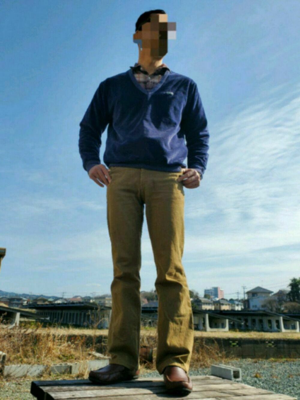 今日は久々に暖かく天気もいい気持ちいい日。 めったに履かないブーツカットと十数年前に古着で購入したネイビーのvネックセーターをあわせてみました。ブーツカット足がすっきり見えるのでオススメです。
