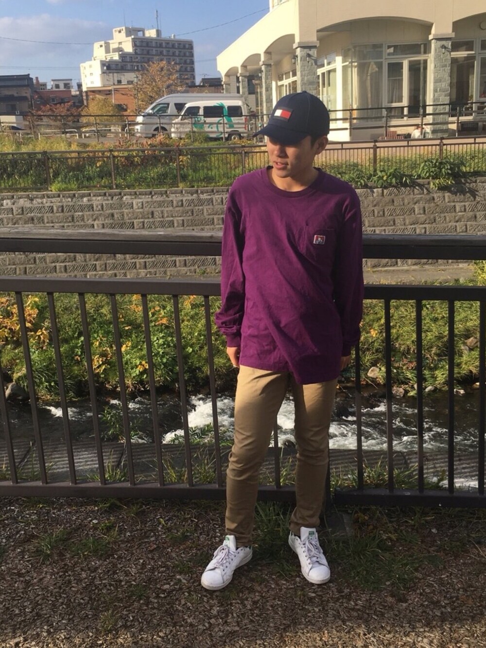 秋らしくパープルとベージュを組み合わせて、少し派手になった全身をネイビーのキャップがまとめてくれます。