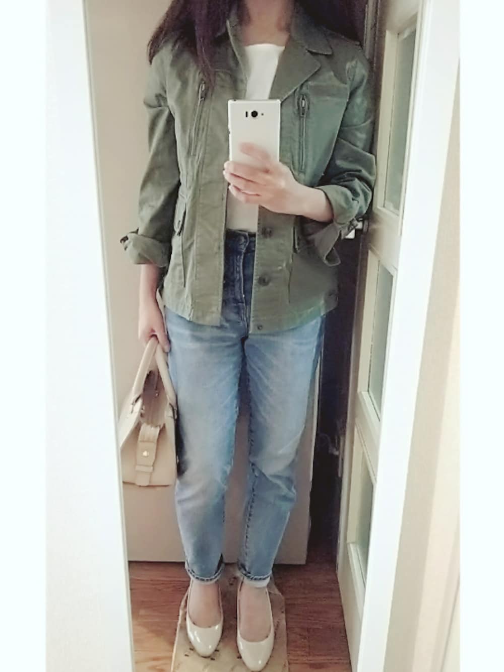 靴を買いにアウトレット行ったら、 ジャケットをまた買ってしまった😂 半額で買えたから良しとする❗ お気に入りのデニムに、安定のベージュ 小物を合わせたコーデです🎵