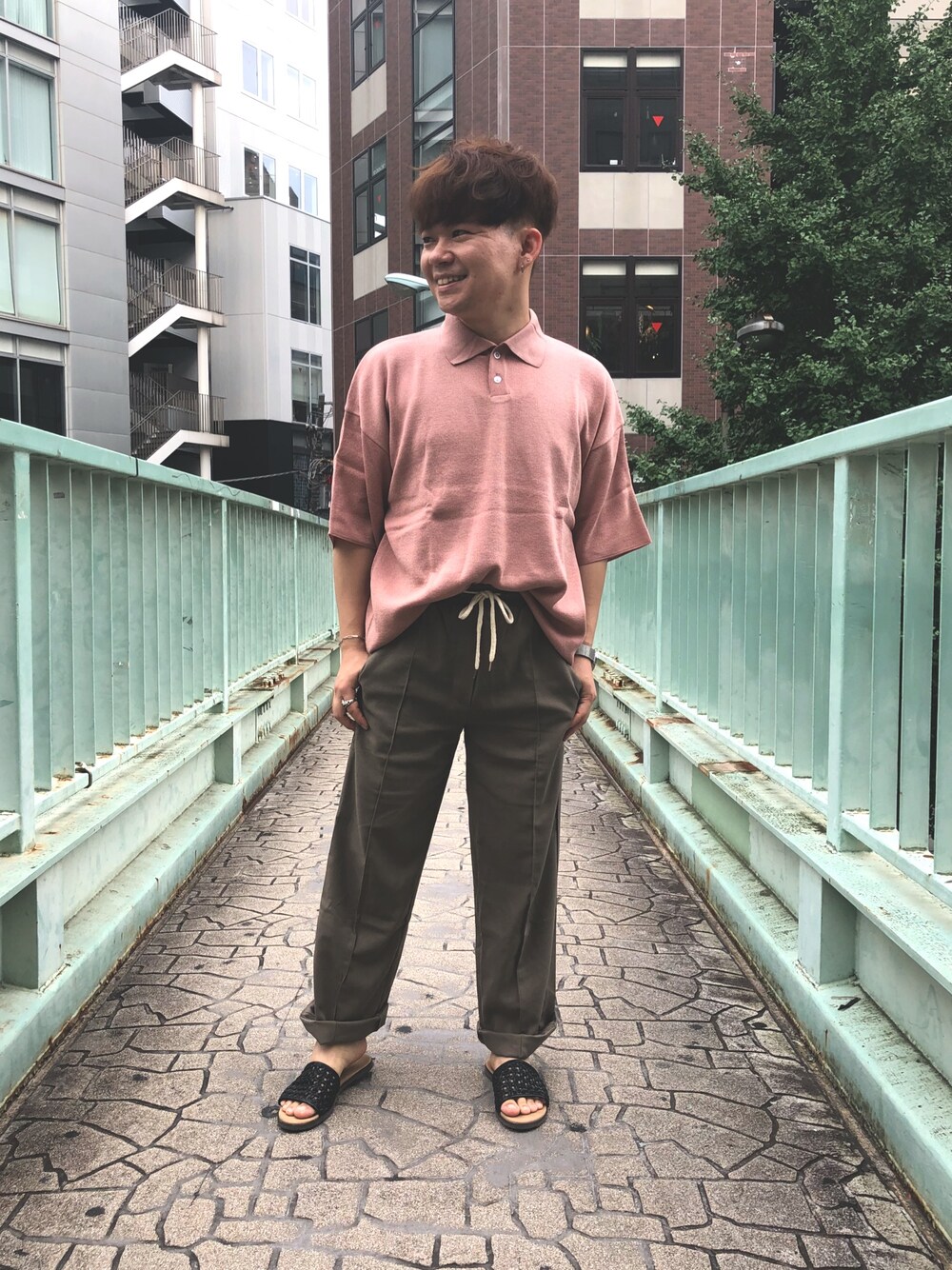 新鮮なピンクのポロニットを主役にコーデ組んでみました👍 リネンのセンタープレスパンツと合わせて キレイめ×ラフなイメージに✨