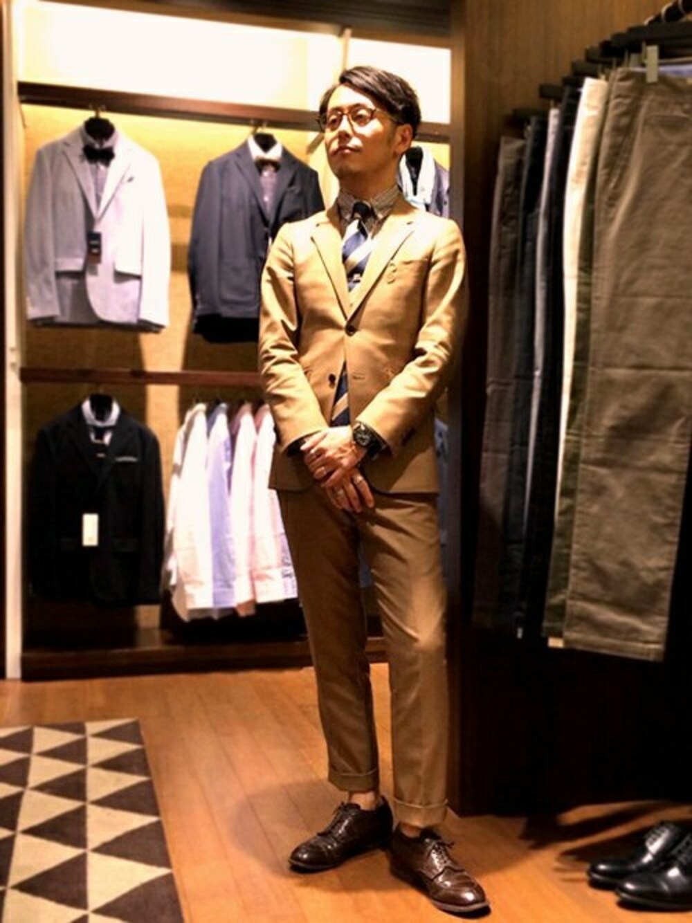 Vゾーンにスーツと同系色のアイテムを使用し、清潔感を演出。 また、パンツをロールアップし、くるぶしを見せることで、春らしいスタイリングを意識してみました。